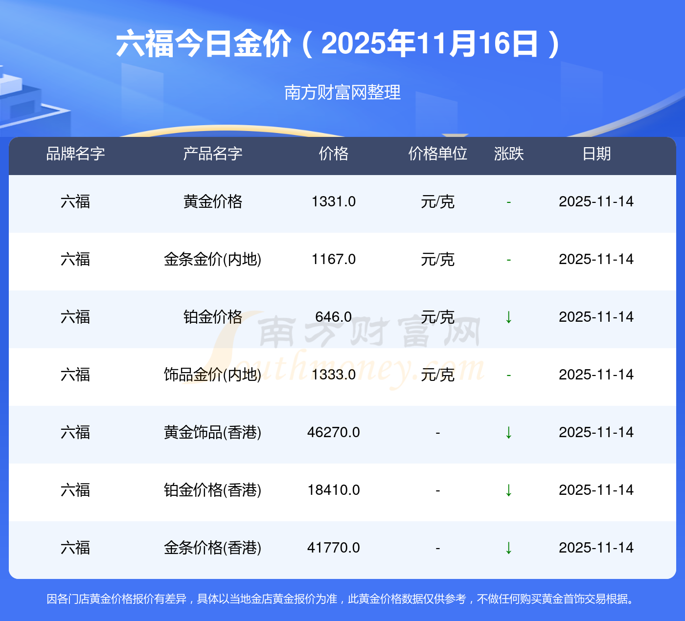 2025年11月16日六福今日價格:黃金價格1333.0元/克,鉑金價格646.0元/克,飾品金價(內(nèi)地)1333.0元/克,黃金飾品(香港)46320.0,鉑金價格(香港)18410.0,金條價格(香港)41780.0,金條金價(內(nèi)地)1167.0元/克,黃金價格1322.0元/克,鉑金價格600.0元/克,足金價格1322.0元/克,黃金價格1295.0元/克。