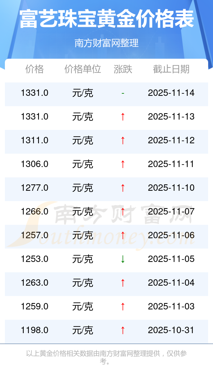 想查詢當(dāng)下黃金價(jià)格,今日黃金一克的價(jià)格是多少呢?黃金每一克的價(jià)位大概是多少呢?今日富藝珠寶 黃金價(jià)格的最新定價(jià)為1331.0元/克。