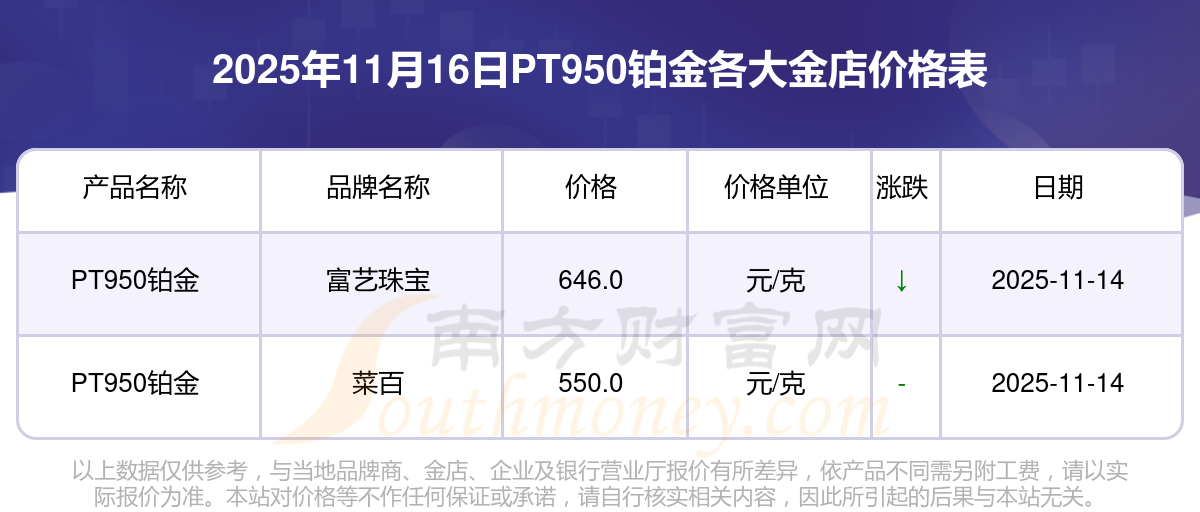 2025年11月16日,周大福、周大福、周大福、周大福、周大福、周大福、周大福、老鳳祥、老鳳祥、老鳳祥、周六福等各大金店品牌PT950鉑金今日價格如下:周大福1333.0元/克、周大福646.0元/克、周大福1333.0元/克、周大福46320.0、周大福18410.0、周大福41780.0、周大福1167.0元/克、老鳳祥1322.0元/克、老鳳祥600.0元/克、老鳳祥1322.0元/克、周六福1295.0元/克。