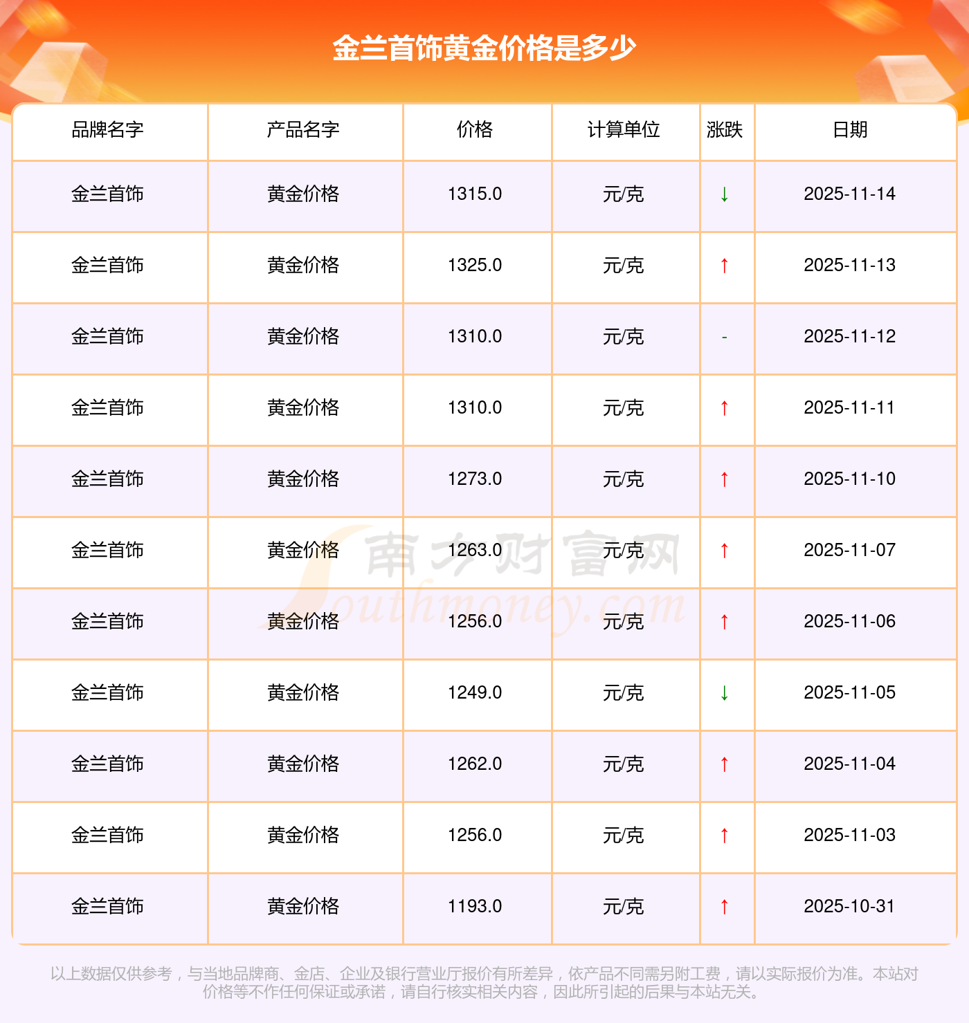 今日(2025年11月16日)金蘭首飾黃金價格是1315.0元/克。