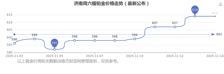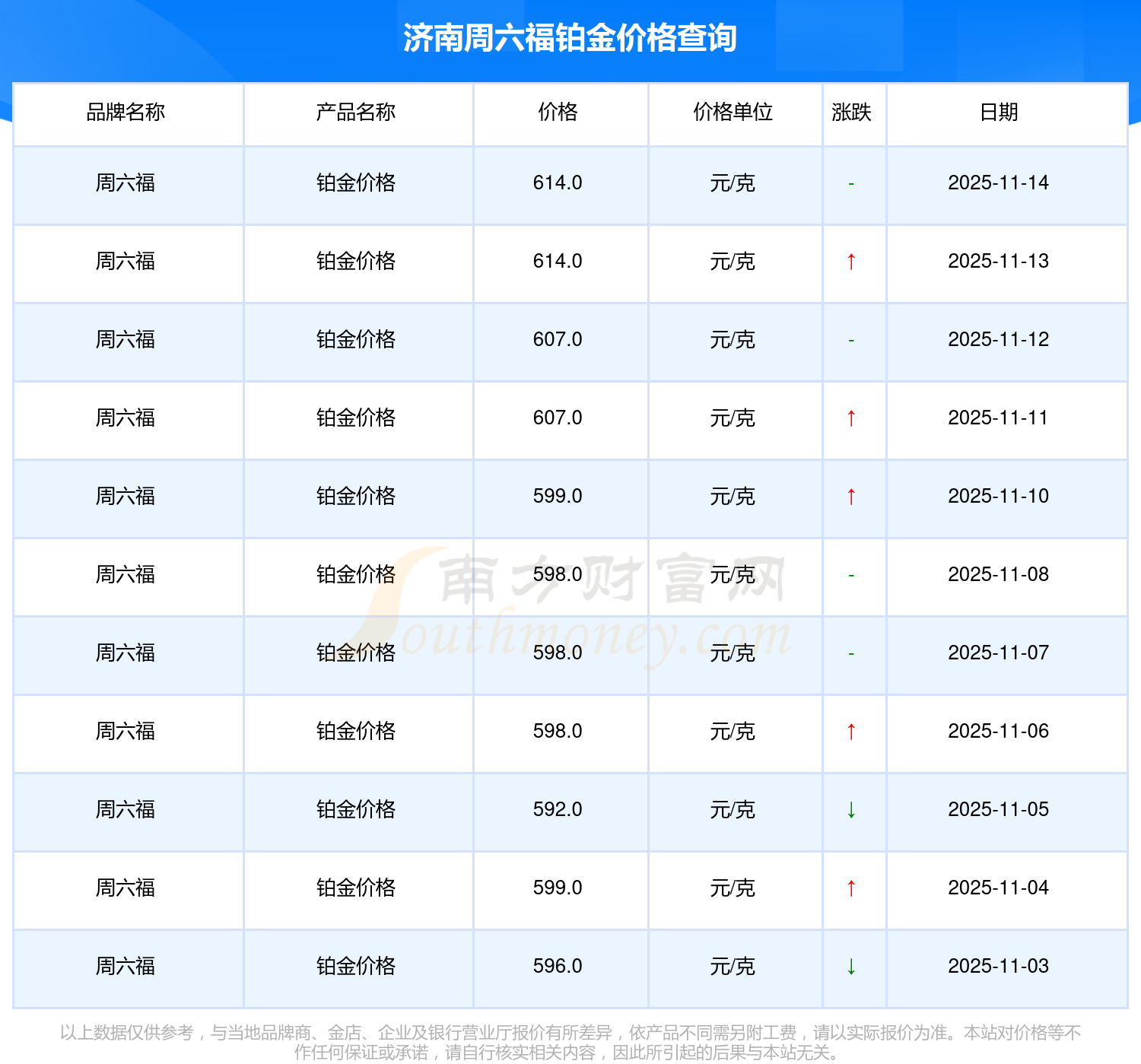 濟(jì)南周六福在 2025年11月16日的鉑金價(jià)格零售價(jià)格為 614.0元/克。