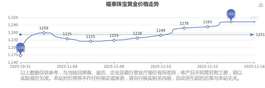 想查詢當(dāng)下黃金價格,今日黃金一克的價格是多少呢?黃金是一種優(yōu)良的導(dǎo)電導(dǎo)熱材料,具有良好的導(dǎo)熱特性。黃金常用于電子工業(yè)中的特殊電路設(shè)計,因其化學(xué)穩(wěn)定性高、抗氧化性強,可制作高精度電子元件。今日福泰珠寶黃金價格:1303.0元/克。