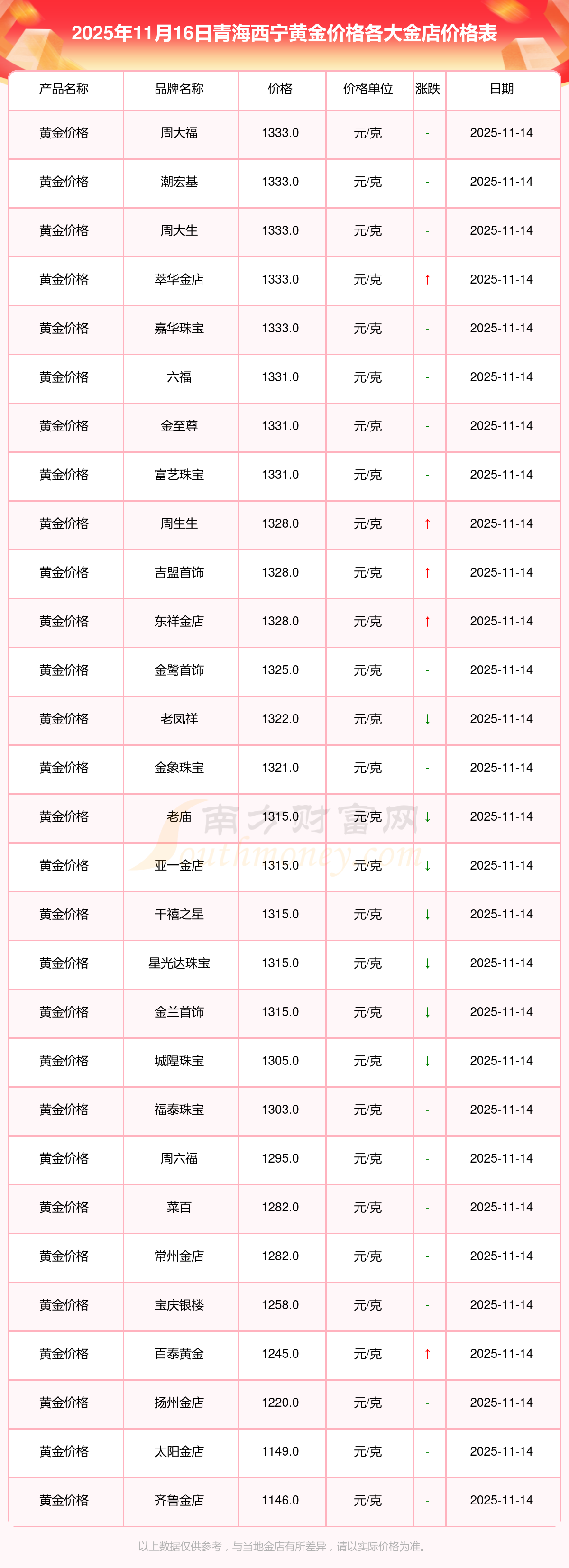 2025年11月16日,青海西寧周大福、周大福、周大福、周大福、周大福、周大福、周大福、老鳳祥、老鳳祥、老鳳祥、周六福等各大金店品牌黃金價(jià)格今日價(jià)格如下:周大福1333.0元/克、周大福646.0元/克、周大福1333.0元/克、周大福46320.0、周大福18410.0、周大福41780.0、周大福1167.0元/克、老鳳祥1322.0元/克、老鳳祥600.0元/克、老鳳祥1322.0元/克、周六福1295.0元/克。