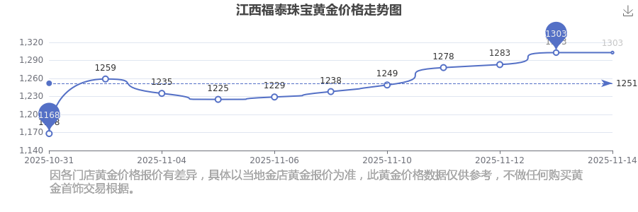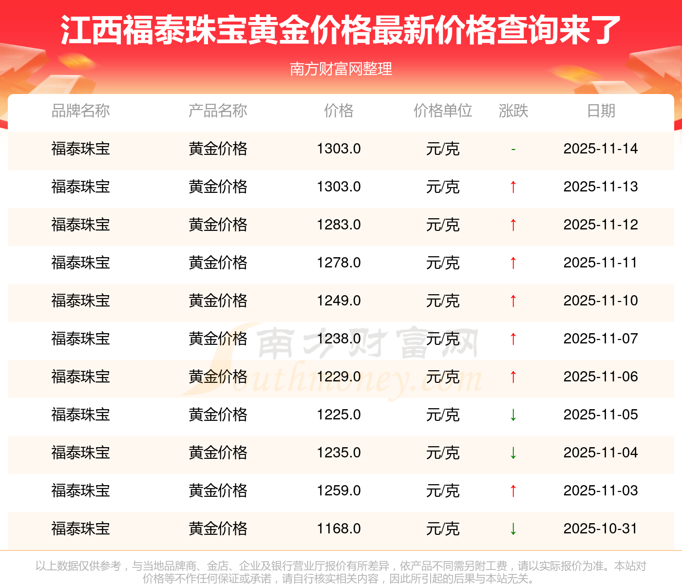 今日江西福泰珠寶黃金價(jià)格最新價(jià)格是1303.0元/克。