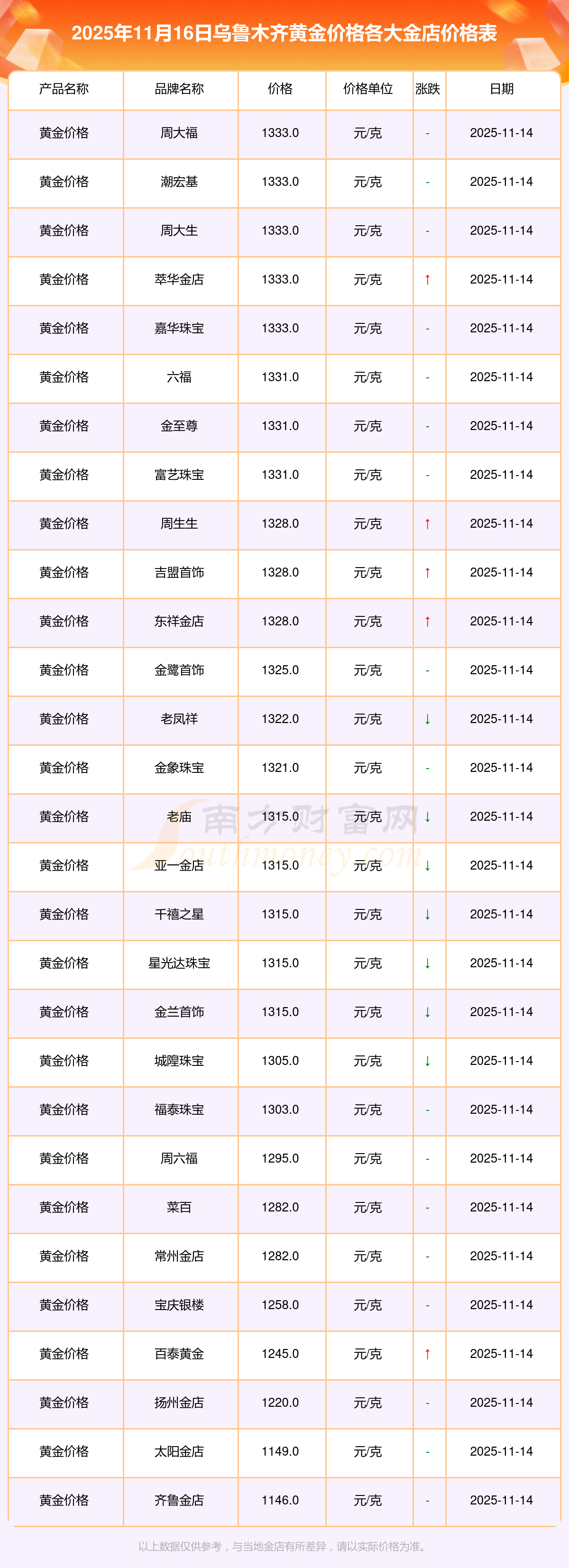 2025年11月16日烏魯木齊周大福、周大福、周大福、周大福、周大福、周大福、周大福、老鳳祥、老鳳祥、老鳳祥、周六福等各大金店品牌黃金價(jià)格最新價(jià)格行情來了,如下:周大福黃金價(jià)格1333.0元/克,周大福鉑金價(jià)格646.0元/克,周大福飾品金價(jià)(內(nèi)地)1333.0元/克,周大福黃金飾品(香港)46320.0,周大福鉑金價(jià)格(香港)18410.0,周大福金條價(jià)格(香港)41780.0,周大福金條金價(jià)(內(nèi)地)1167.0元/克,老鳳祥黃金價(jià)格1322.0元/克,老鳳祥鉑金價(jià)格600.0元/克,老鳳祥足金價(jià)格1322.0元/克,周六福黃金價(jià)格1295.0元/克。