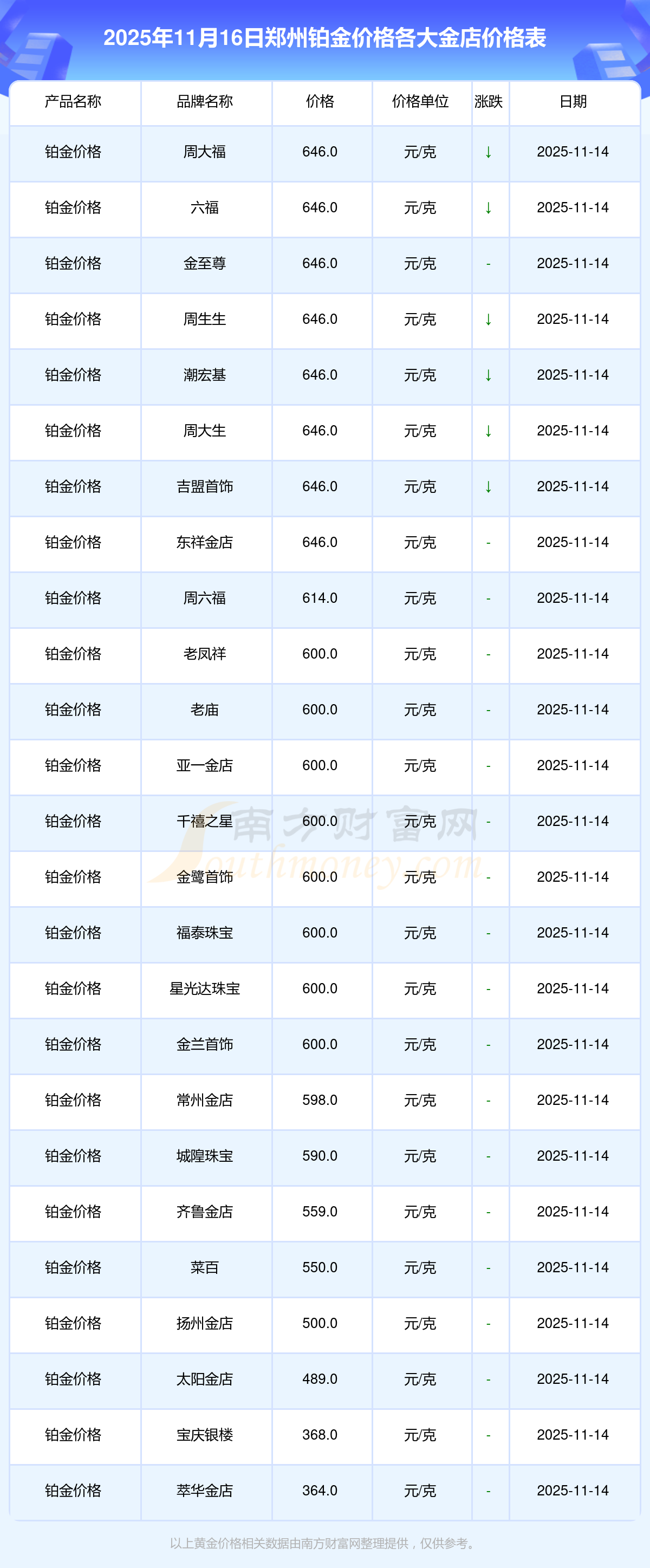 2025年11月16日,鄭州周大福、周大福、周大福、周大福、周大福、周大福、周大福、老鳳祥、老鳳祥、老鳳祥、周六福等各大金店品牌鉑金價格今日價格如下:周大福1333.0元/克、周大福646.0元/克、周大福1333.0元/克、周大福46320.0、周大福18410.0、周大福41780.0、周大福1167.0元/克、老鳳祥1322.0元/克、老鳳祥600.0元/克、老鳳祥1322.0元/克、周六福1295.0元/克。