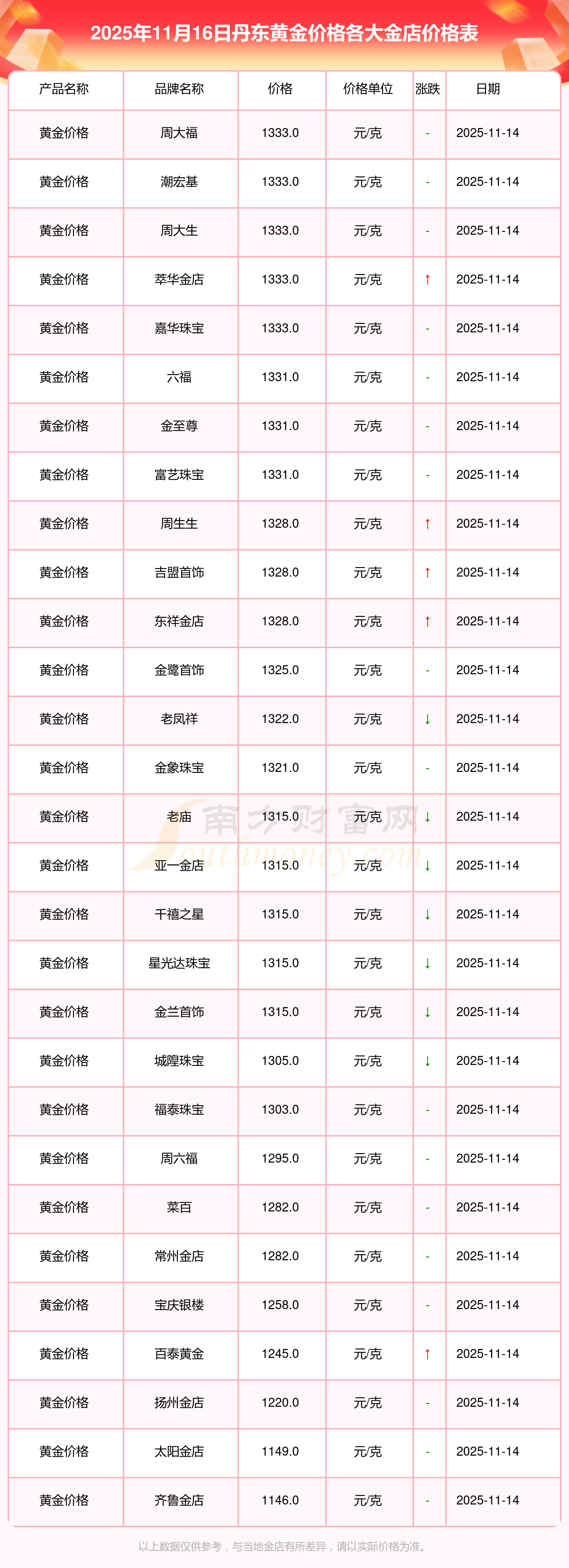 2025年11月16日丹東各大金店黃金價(jià)格最新價(jià)格:周大福1333.0元/克,周大福646.0元/克,周大福1333.0元/克,周大福46320.0,周大福18410.0,周大福41780.0,周大福1167.0元/克,老鳳祥1322.0元/克,老鳳祥600.0元/克,老鳳祥1322.0元/克,周六福1295.0元/克。