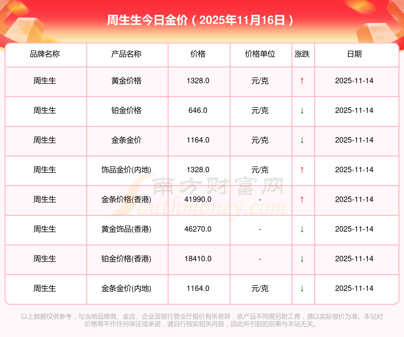 今天是2025年11月16日,周大福、周大福、周大福、周大福、周大福、周大福、周大福、老鳳祥、老鳳祥、老鳳祥、周六福等各大金店品牌黃金價格最新價格如下:周大福1333.0元/克、周大福646.0元/克、周大福1333.0元/克、周大福46320.0、周大福18410.0、周大福41780.0、周大福1167.0元/克、老鳳祥1322.0元/克、老鳳祥600.0元/克、老鳳祥1322.0元/克、周六福1295.0元/克。