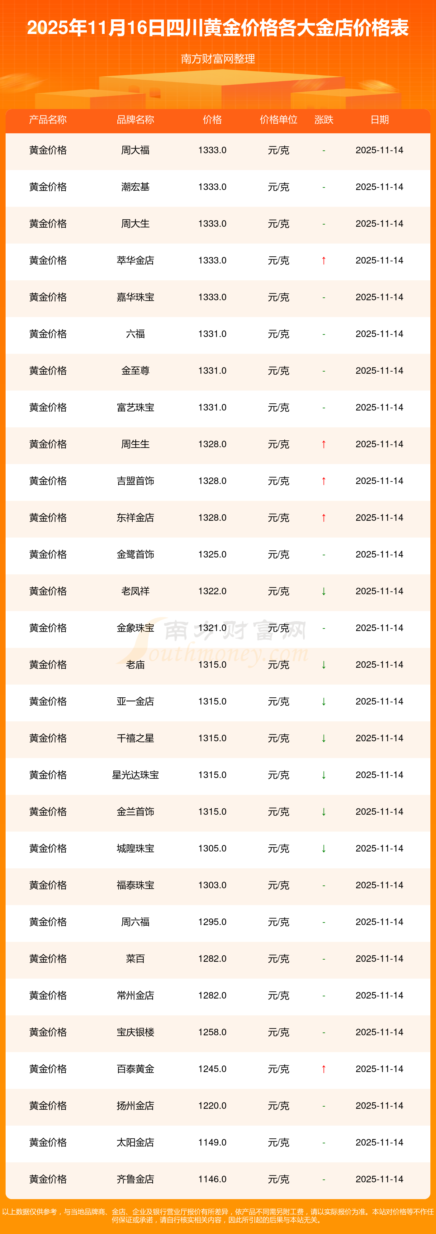 2025年11月16日四川周大福、周大福、周大福、周大福、周大福、周大福、周大福、老鳳祥、老鳳祥、老鳳祥、周六福等各大金店品牌黃金價格最新價格如下:周大福黃金價格1333.0元/克,周大福鉑金價格646.0元/克,周大福飾品金價(內(nèi)地)1333.0元/克,周大福黃金飾品(香港)46320.0,周大福鉑金價格(香港)18410.0,周大福金條價格(香港)41780.0,周大福金條金價(內(nèi)地)1167.0元/克,老鳳祥黃金價格1322.0元/克,老鳳祥鉑金價格600.0元/克,老鳳祥足金價格1322.0元/克,周六福黃金價格1295.0元/克。
