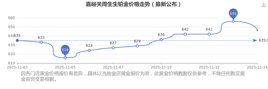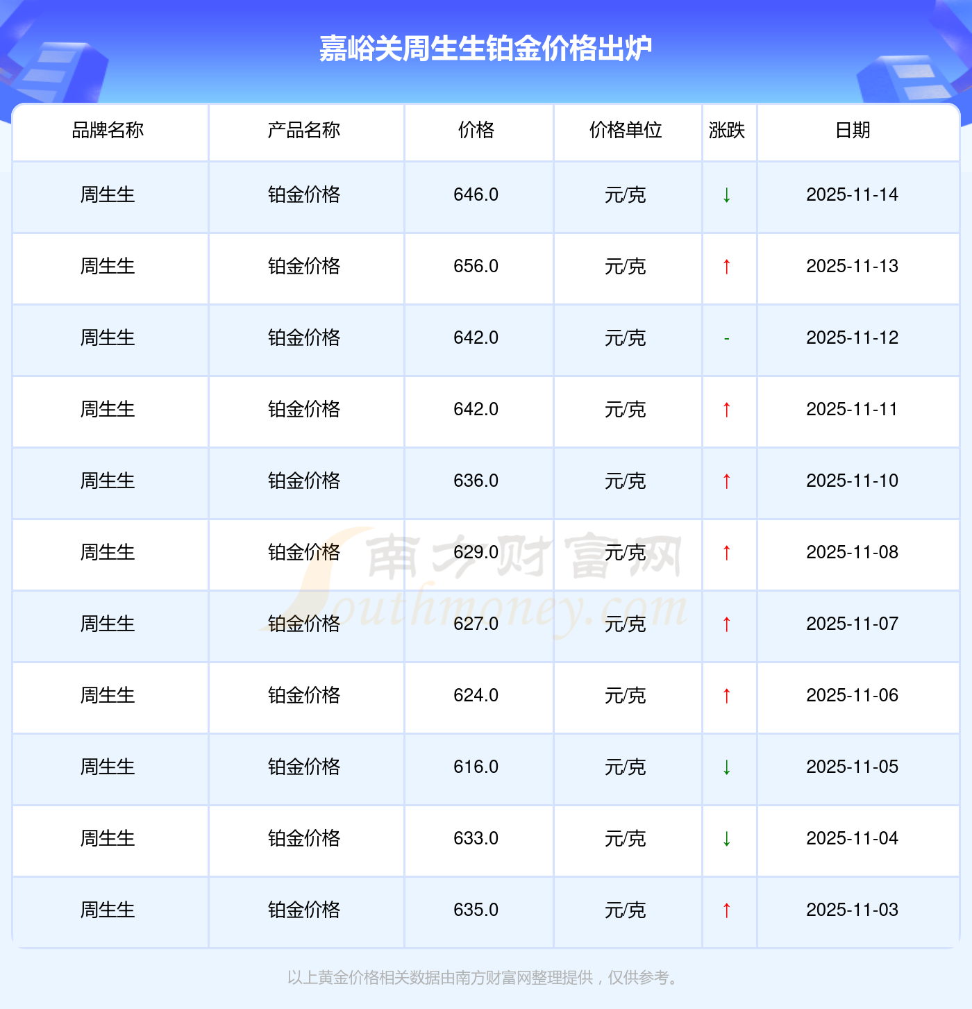 646.0元/克,此乃嘉峪關(guān)周生生于 2025年11月16日鉑金價(jià)格的掛牌價(jià)格。