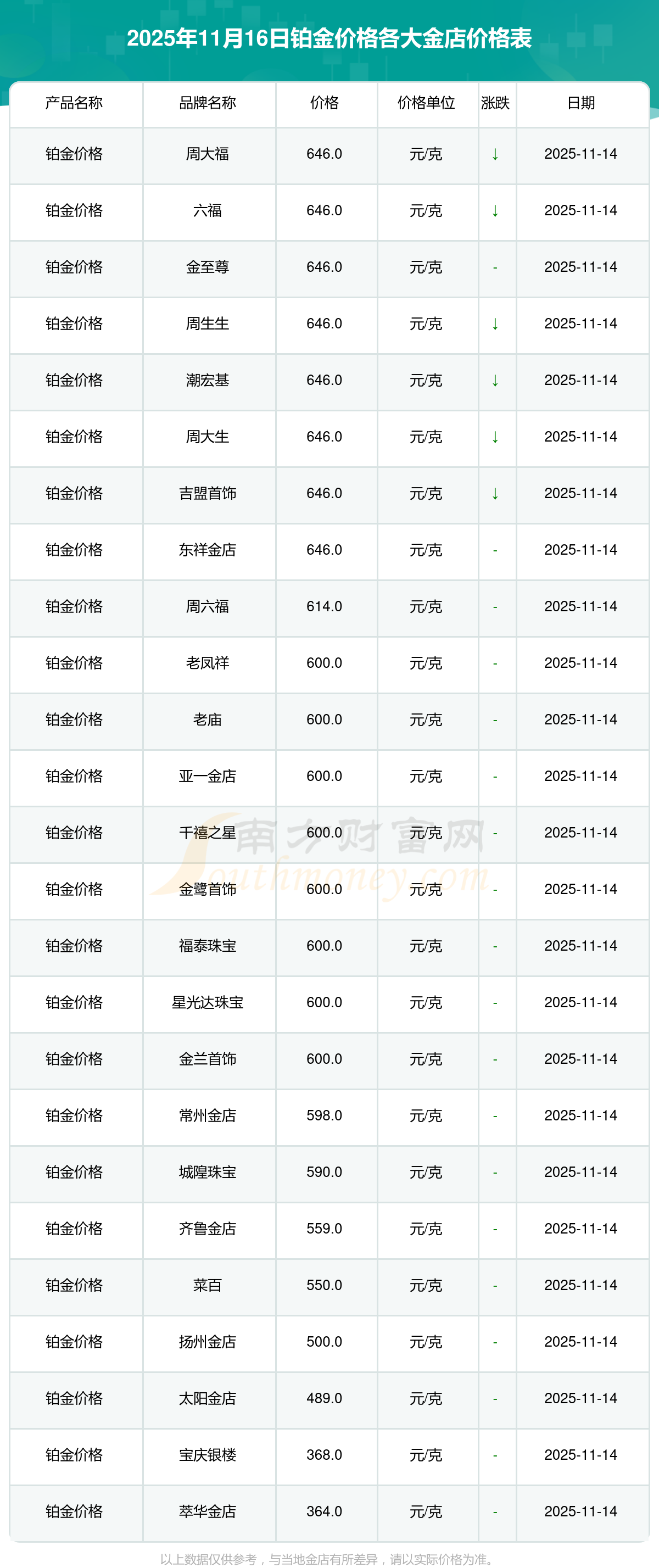 今天是2025年11月16日,周大福、周大福、周大福、周大福、周大福、周大福、周大福、老鳳祥、老鳳祥、老鳳祥、周六福等各大金店品牌鉑金價(jià)格最新價(jià)格如下:周大福1333.0元/克、周大福646.0元/克、周大福1333.0元/克、周大福46320.0、周大福18410.0、周大福41780.0、周大福1167.0元/克、老鳳祥1322.0元/克、老鳳祥600.0元/克、老鳳祥1322.0元/克、周六福1295.0元/克。