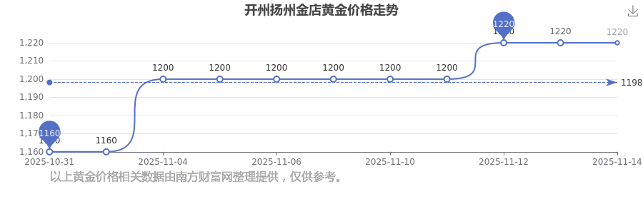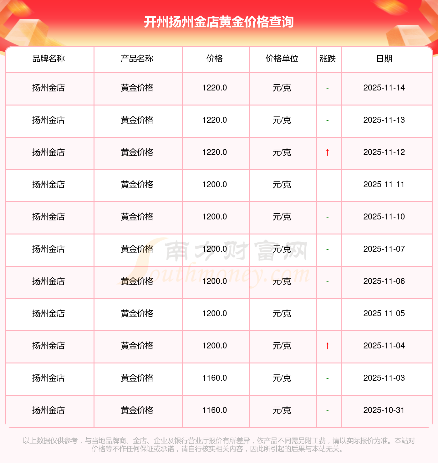 開州揚(yáng)州金店今日黃金價格每克多少錢,今天黃金一克在店鋪里的售價是多少?今日開州揚(yáng)州金店黃金價格查詢,開州揚(yáng)州金店黃金價格在 2025年11月16日為 1220.0元/克。