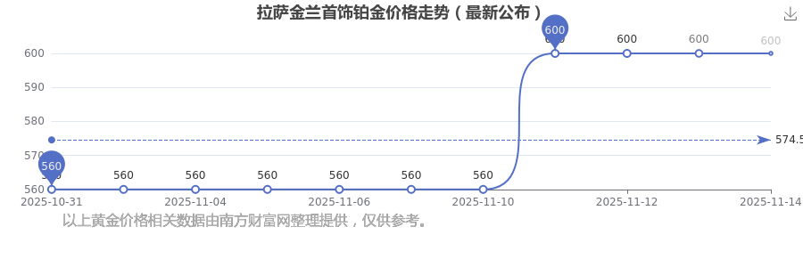 今日(2025年11月16日),拉薩金蘭首飾鉑金價(jià)格:600.0元/克。