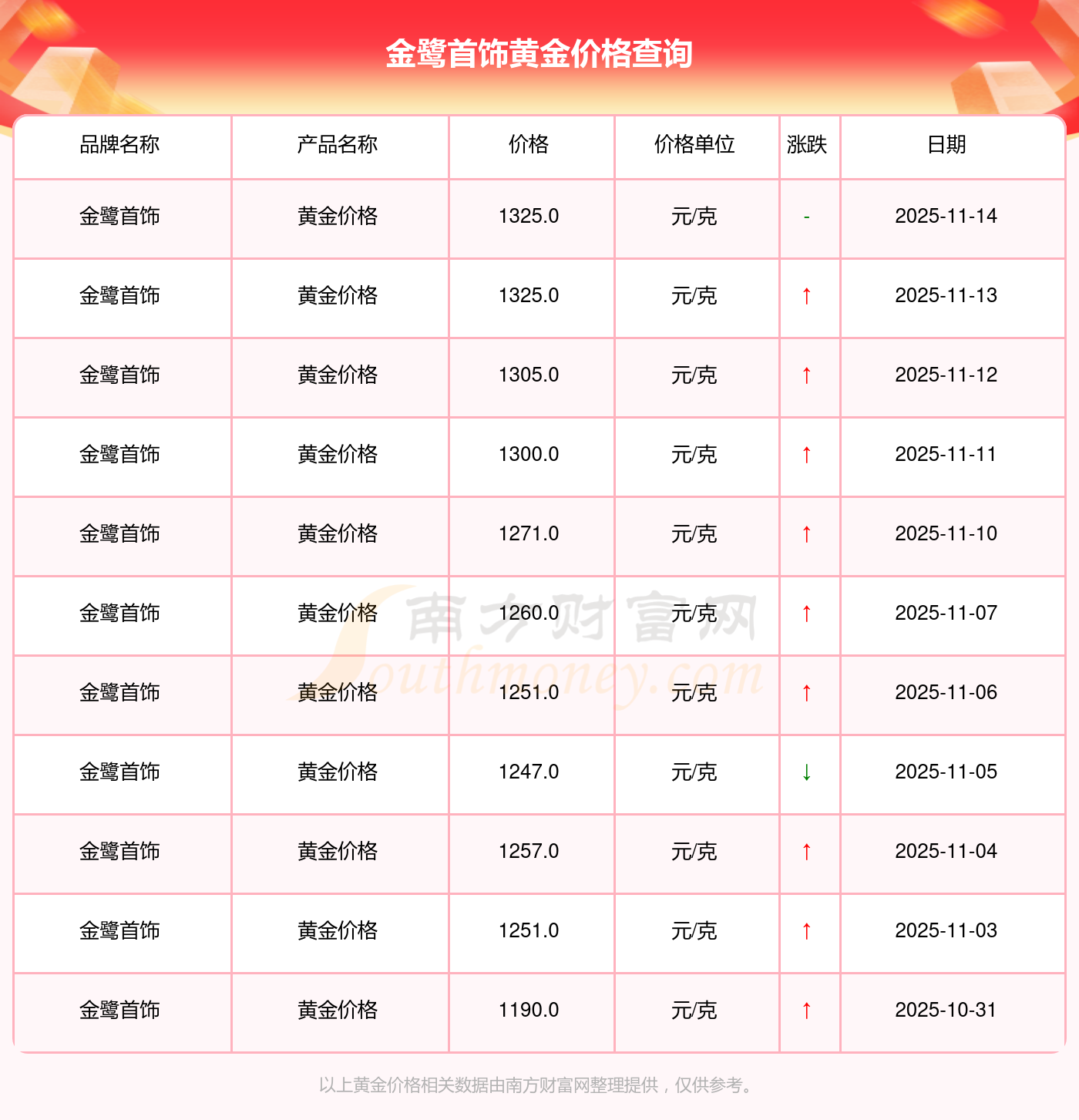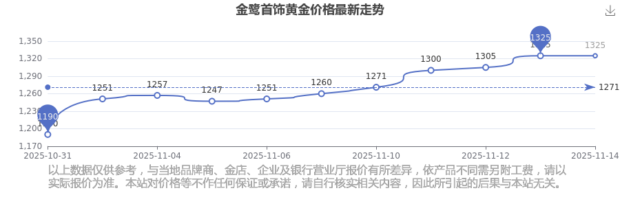 今天黃金價格行情如何?現(xiàn)在一克黃金的售價是多少?通常情況下黃金每一克的價格大概是多少呢?金鷺首飾 黃金價格在今日的最新價格顯示為1325.0元/克。
