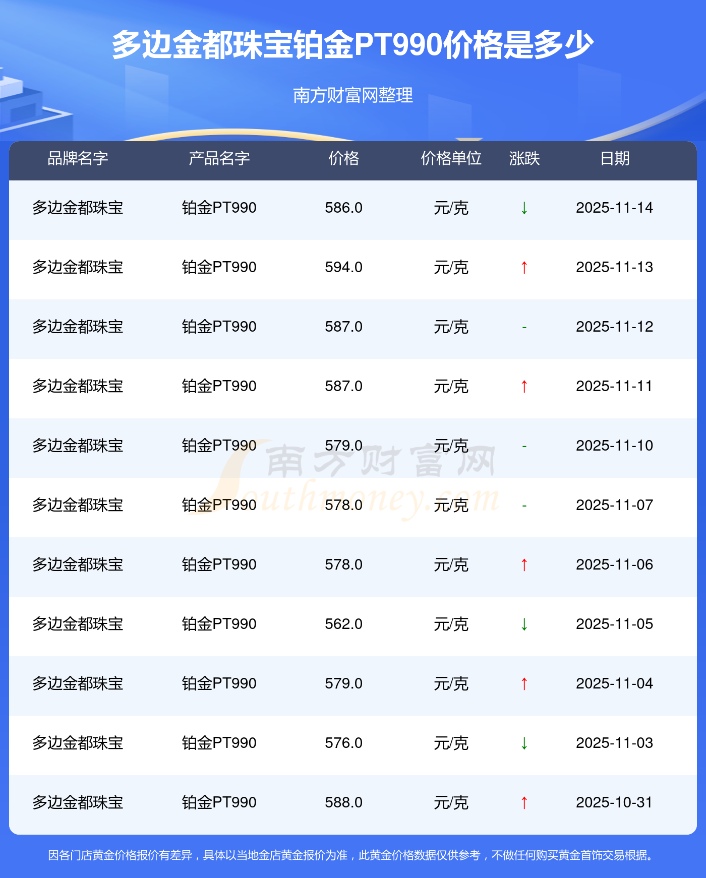 今日(2025年11月16日)多邊金都珠寶鉑金PT990的價(jià)格為586.0元/克。