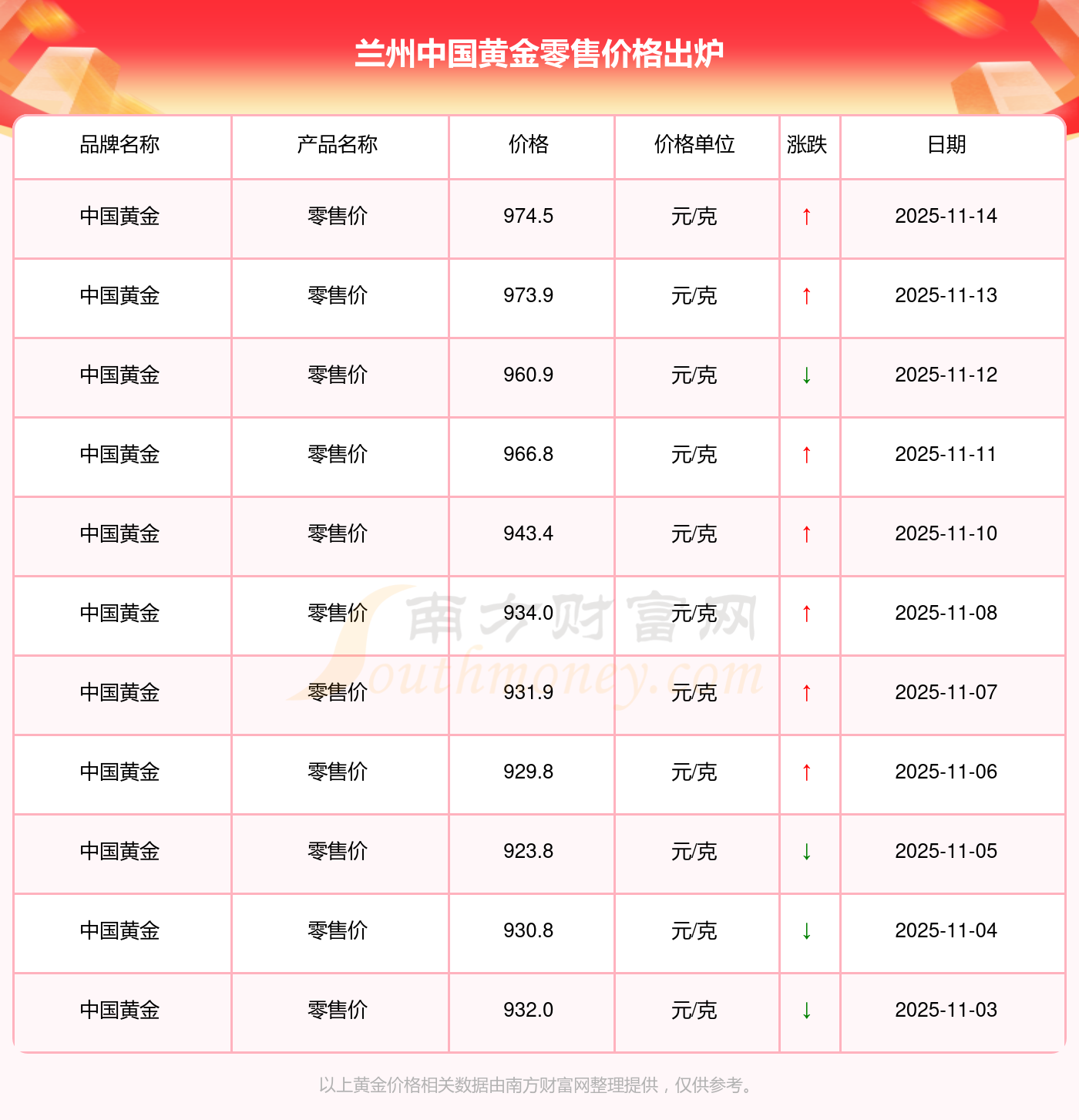 今日(2025年11月16日),974.5元/克是蘭州中國黃金零售價的價格標準。