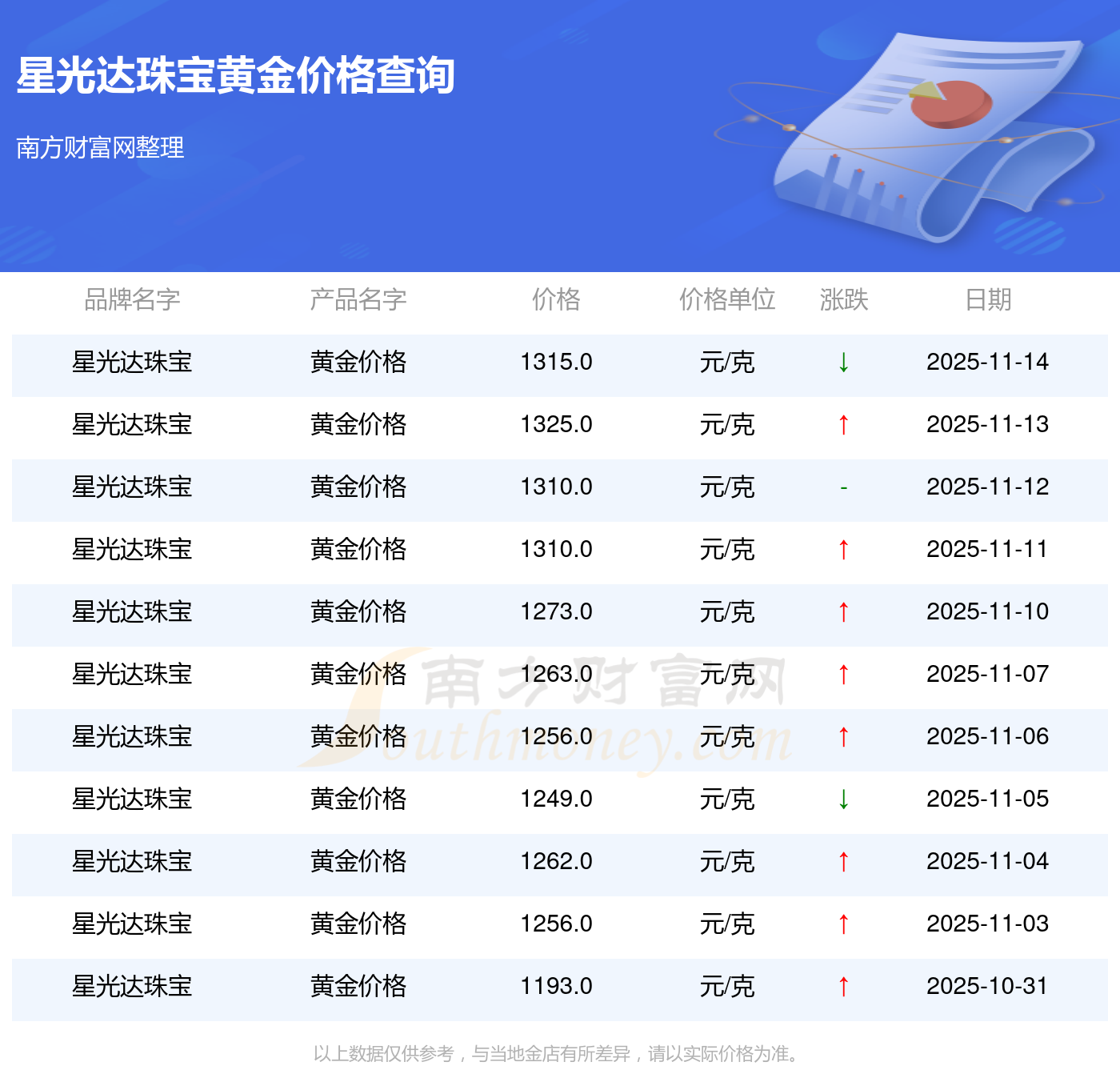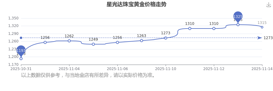星光達珠寶 黃金價格在今日的最新價格顯示為1315.0元/克。