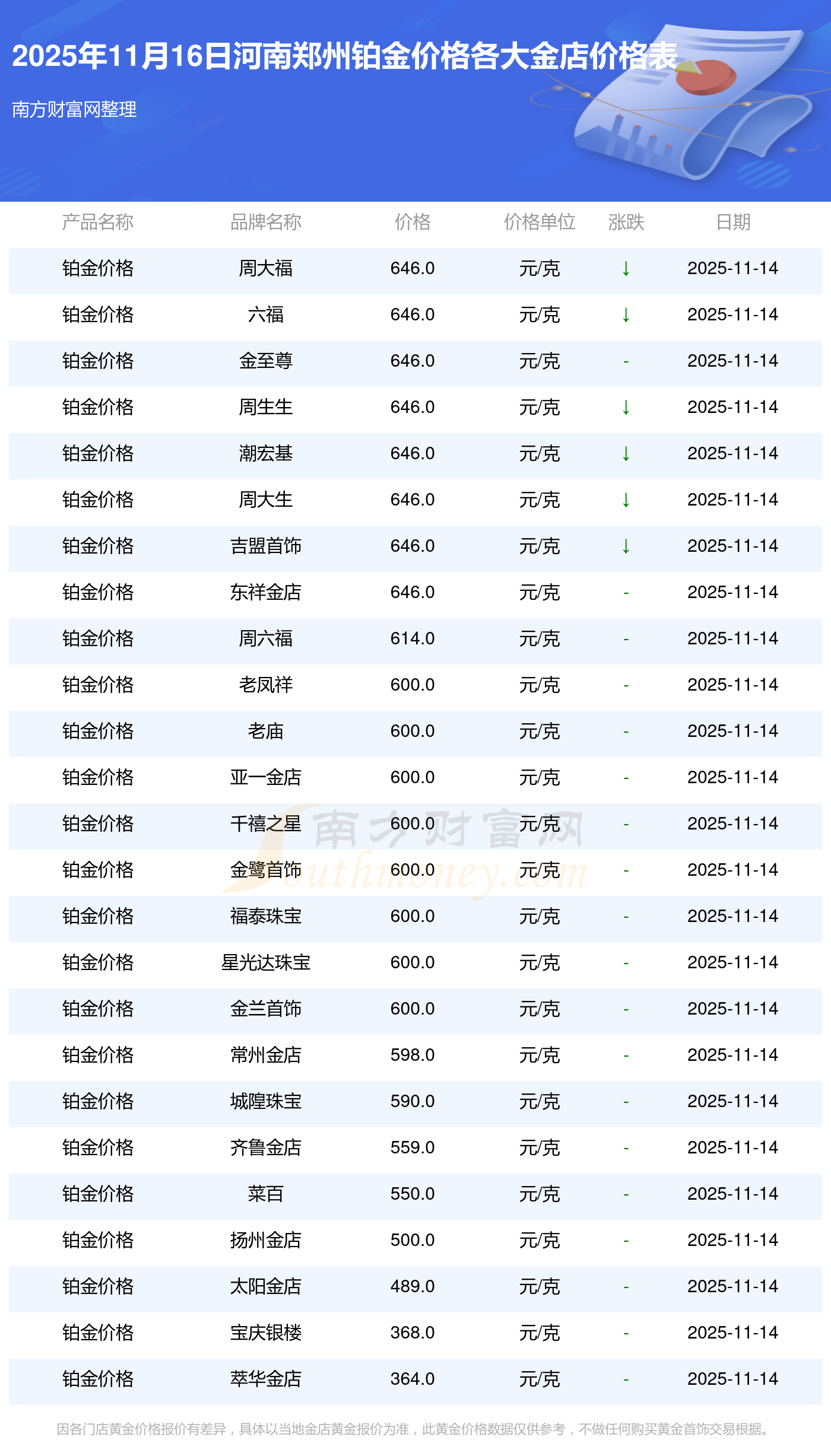 2025年11月16日河南鄭州周大福、周大福、周大福、周大福、周大福、周大福、周大福、老鳳祥、老鳳祥、老鳳祥、周六福等各大金店品牌鉑金價(jià)格最新價(jià)格行情來(lái)了,如下:周大福黃金價(jià)格1333.0元/克,周大福鉑金價(jià)格646.0元/克,周大福飾品金價(jià)(內(nèi)地)1333.0元/克,周大福黃金飾品(香港)46320.0,周大福鉑金價(jià)格(香港)18410.0,周大福金條價(jià)格(香港)41780.0,周大福金條金價(jià)(內(nèi)地)1167.0元/克,老鳳祥黃金價(jià)格1322.0元/克,老鳳祥鉑金價(jià)格600.0元/克,老鳳祥足金價(jià)格1322.0元/克,周六福黃金價(jià)格1295.0元/克。
