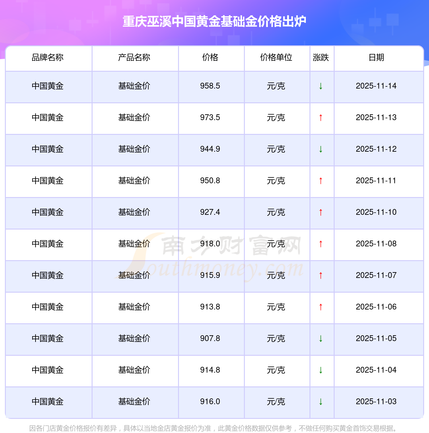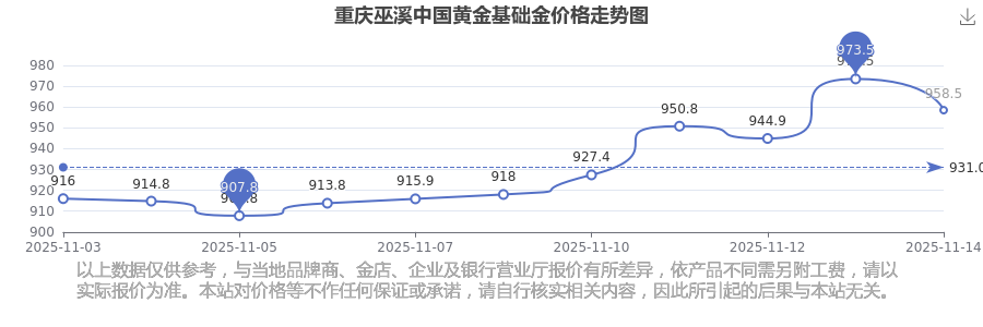 2025年11月16日重慶巫溪中國(guó)黃金基礎(chǔ)金價(jià)格是958.5元/克。