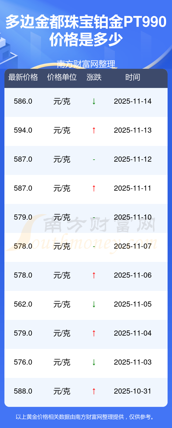 今日多邊金都珠寶鉑金PT990價格最新是586.0元/克。