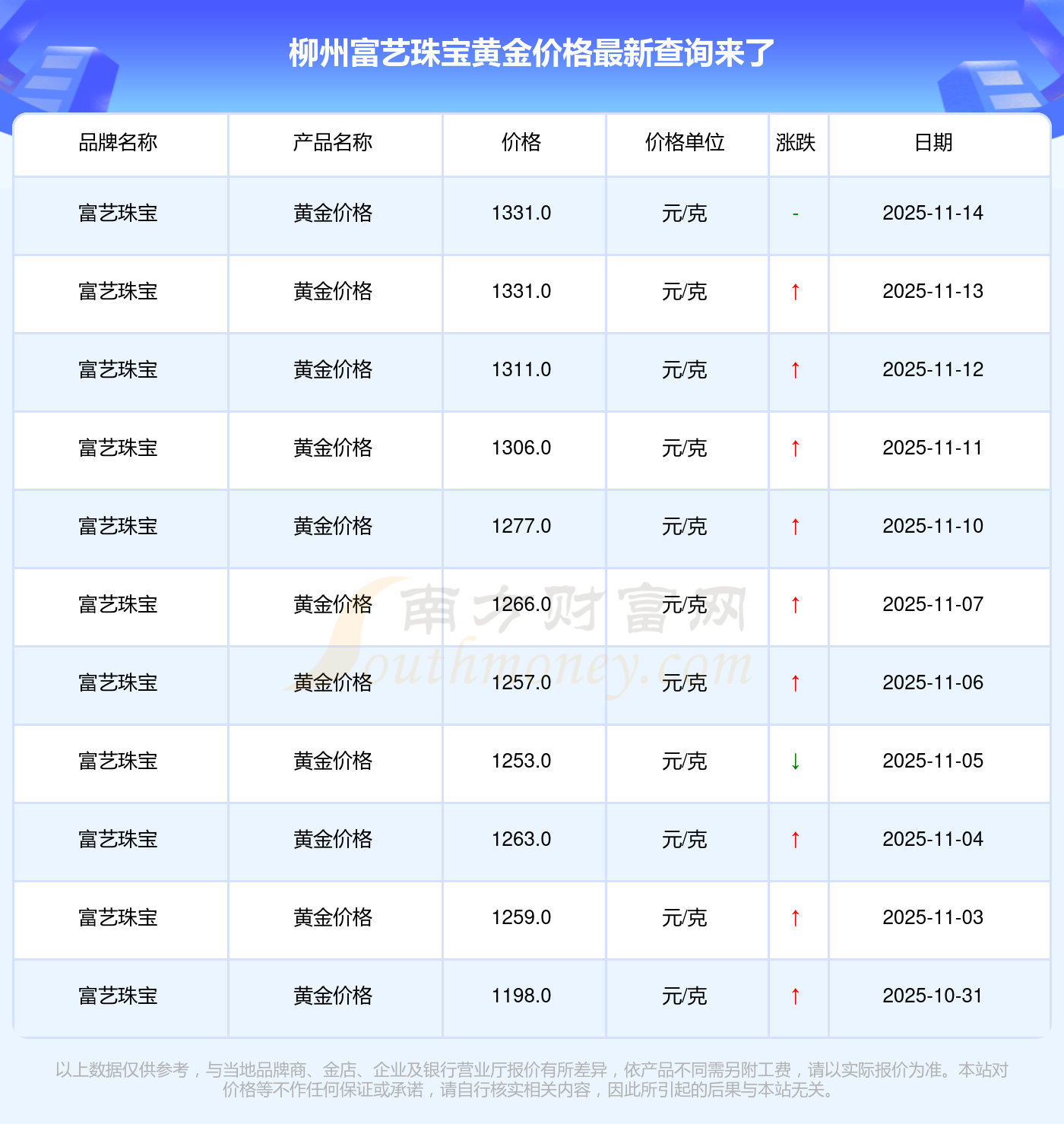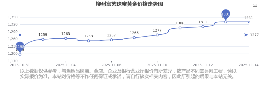 柳州富藝珠寶在 2025年11月16日的黃金價(jià)格零售價(jià)格為 1331.0元/克。