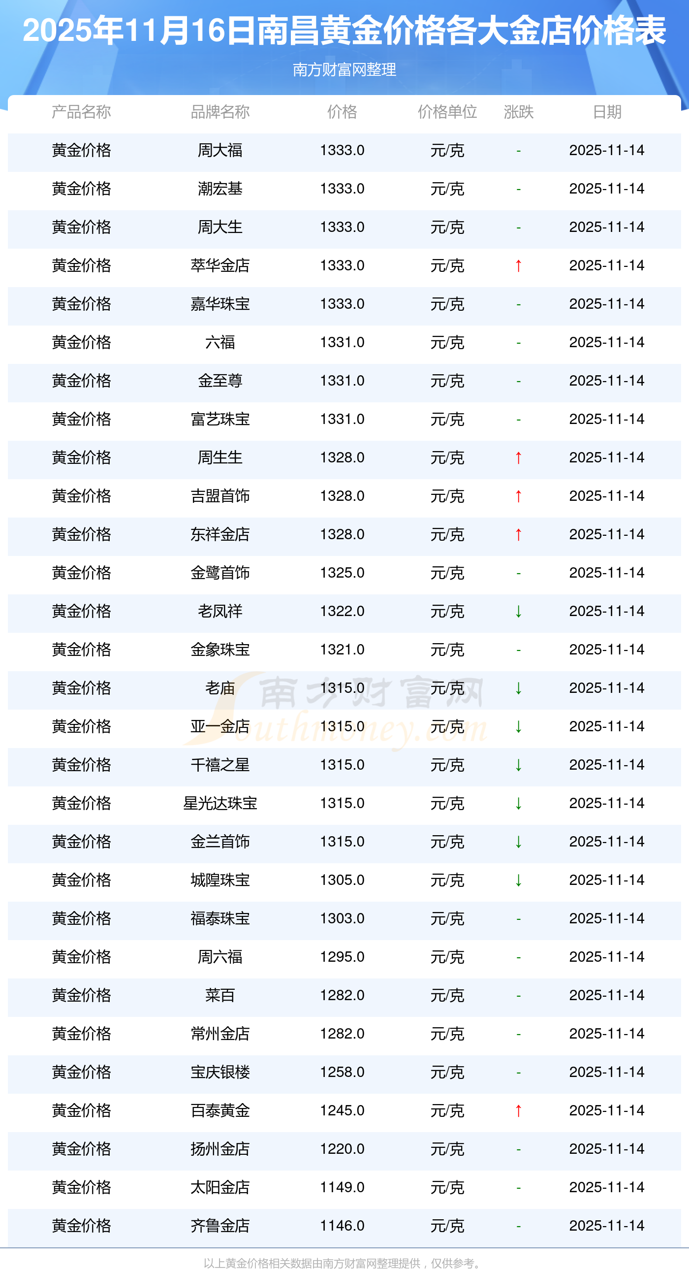 2025年11月16日,南昌周大福、周大福、周大福、周大福、周大福、周大福、周大福、老鳳祥、老鳳祥、老鳳祥、周六福等各大金店品牌黃金價格今日價格如下:周大福1333.0元/克、周大福646.0元/克、周大福1333.0元/克、周大福46320.0、周大福18410.0、周大福41780.0、周大福1167.0元/克、老鳳祥1322.0元/克、老鳳祥600.0元/克、老鳳祥1322.0元/克、周六福1295.0元/克。