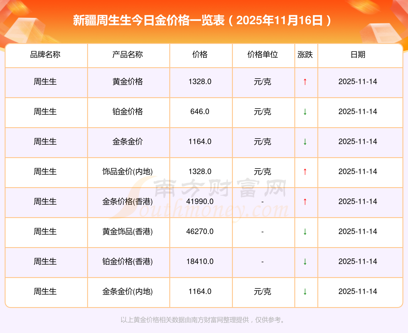 今日黃金售價(jià)多少?現(xiàn)在黃金一克值多少錢(qián)呢? 2025年11月16日新疆周生生金價(jià)查詢:黃金價(jià)格1333.0元/克,鉑金價(jià)格646.0元/克,飾品金價(jià)(內(nèi)地)1333.0元/克,黃金飾品(香港)46320.0,鉑金價(jià)格(香港)18410.0,金條價(jià)格(香港)41780.0,金條金價(jià)(內(nèi)地)1167.0元/克,黃金價(jià)格1322.0元/克,鉑金價(jià)格600.0元/克,足金價(jià)格1322.0元/克,黃金價(jià)格1295.0元/克。