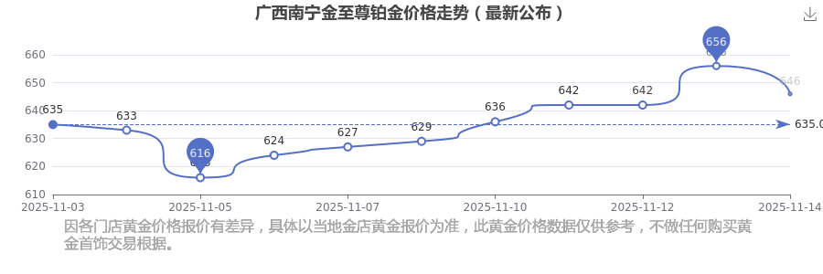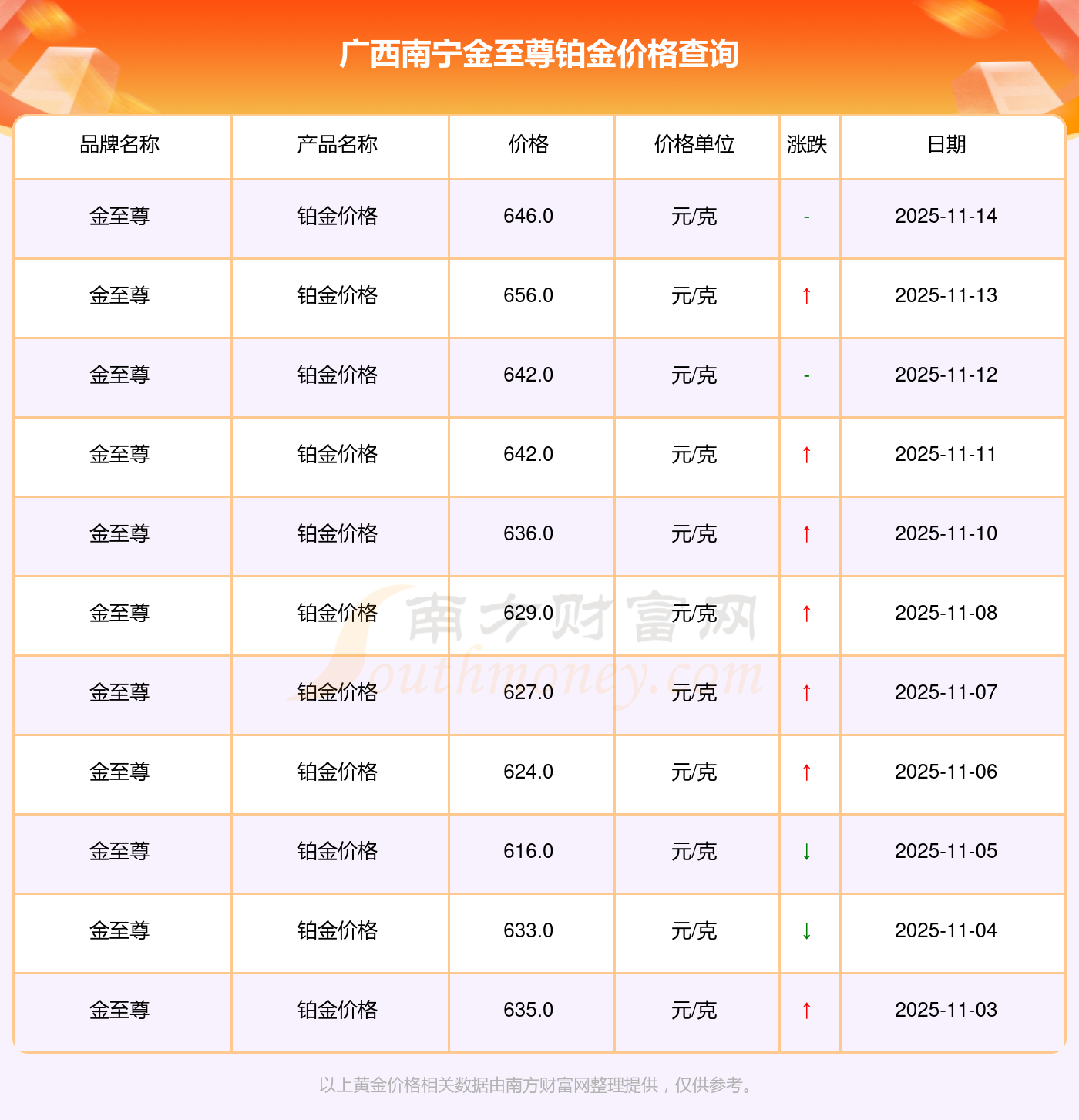 2025年11月16日廣西南寧金至尊鉑金價格是646.0元/克。