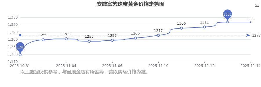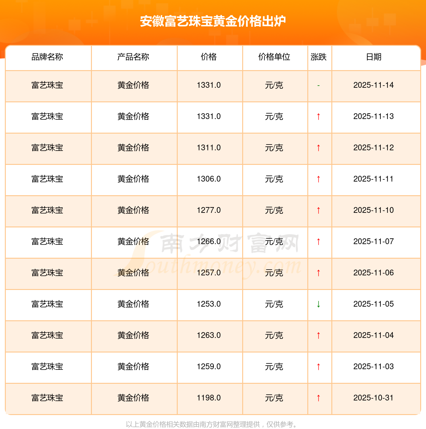 2025年11月16日安徽富藝珠寶黃金價格:1331.0元/克。