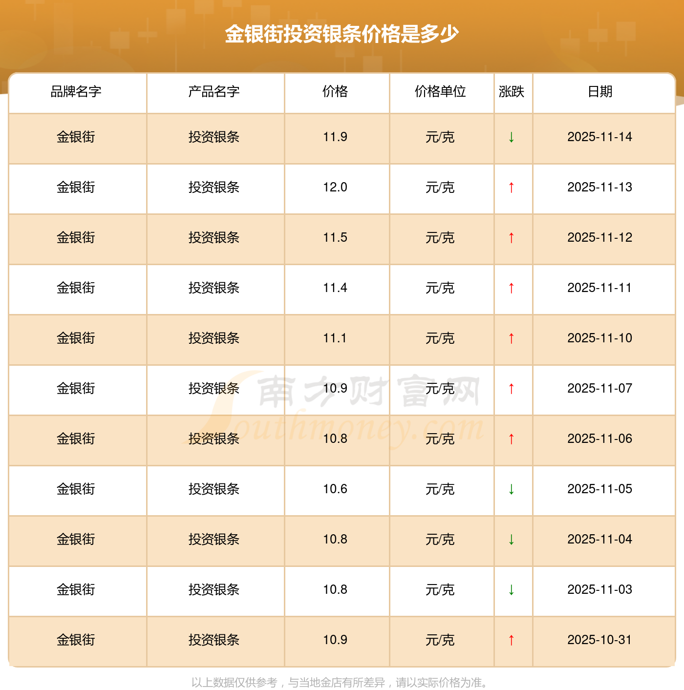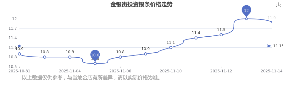金銀街今日投資銀條的最新市場(chǎng)行情價(jià)為11.9元/克。