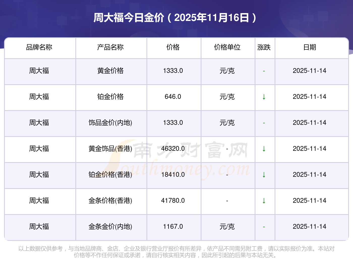 周大福今日黃金價格行情如何:黃金價格1333.0元/克,鉑金價格646.0元/克,飾品金價(內(nèi)地)1333.0元/克,黃金飾品(香港)46320.0,鉑金價格(香港)18410.0,金條價格(香港)41780.0,金條金價(內(nèi)地)1167.0元/克,黃金價格1322.0元/克,鉑金價格600.0元/克,足金價格1322.0元/克,黃金價格1295.0元/克。