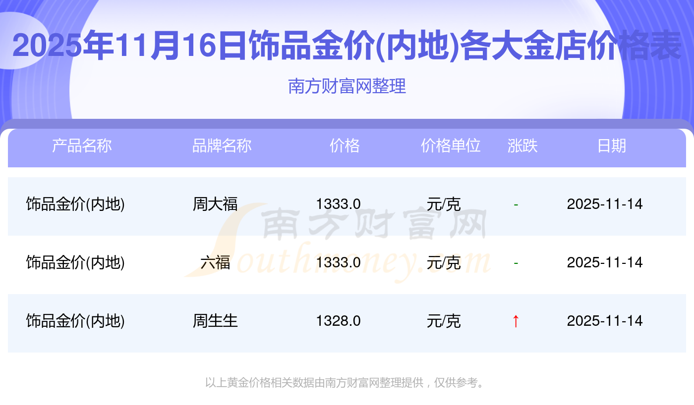 今天是2025年11月16日,周大福、周大福、周大福、周大福、周大福、周大福、周大福、老鳳祥、老鳳祥、老鳳祥、周六福等各大金店品牌飾品金價(內(nèi)地)最新價格如下:周大福1333.0元/克、周大福646.0元/克、周大福1333.0元/克、周大福46320.0、周大福18410.0、周大福41780.0、周大福1167.0元/克、老鳳祥1322.0元/克、老鳳祥600.0元/克、老鳳祥1322.0元/克、周六福1295.0元/克。