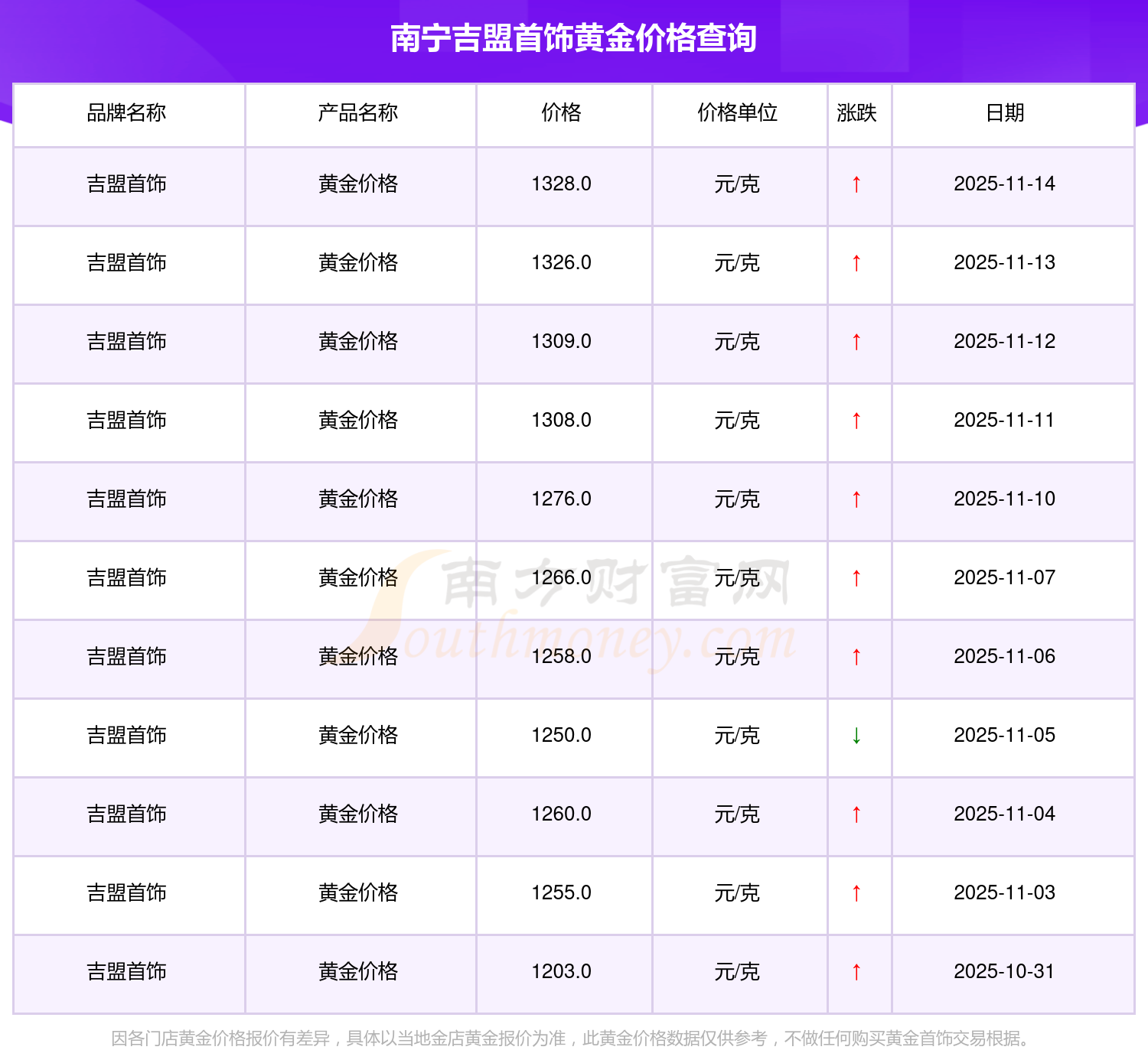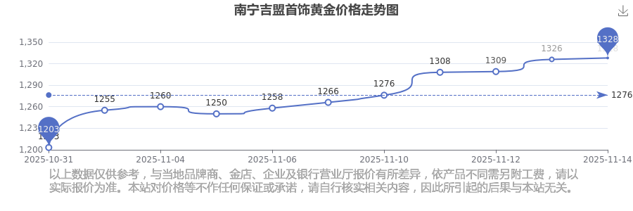 今日2025年11月16日,南寧吉盟首飾黃金價格為1328.0元/克。