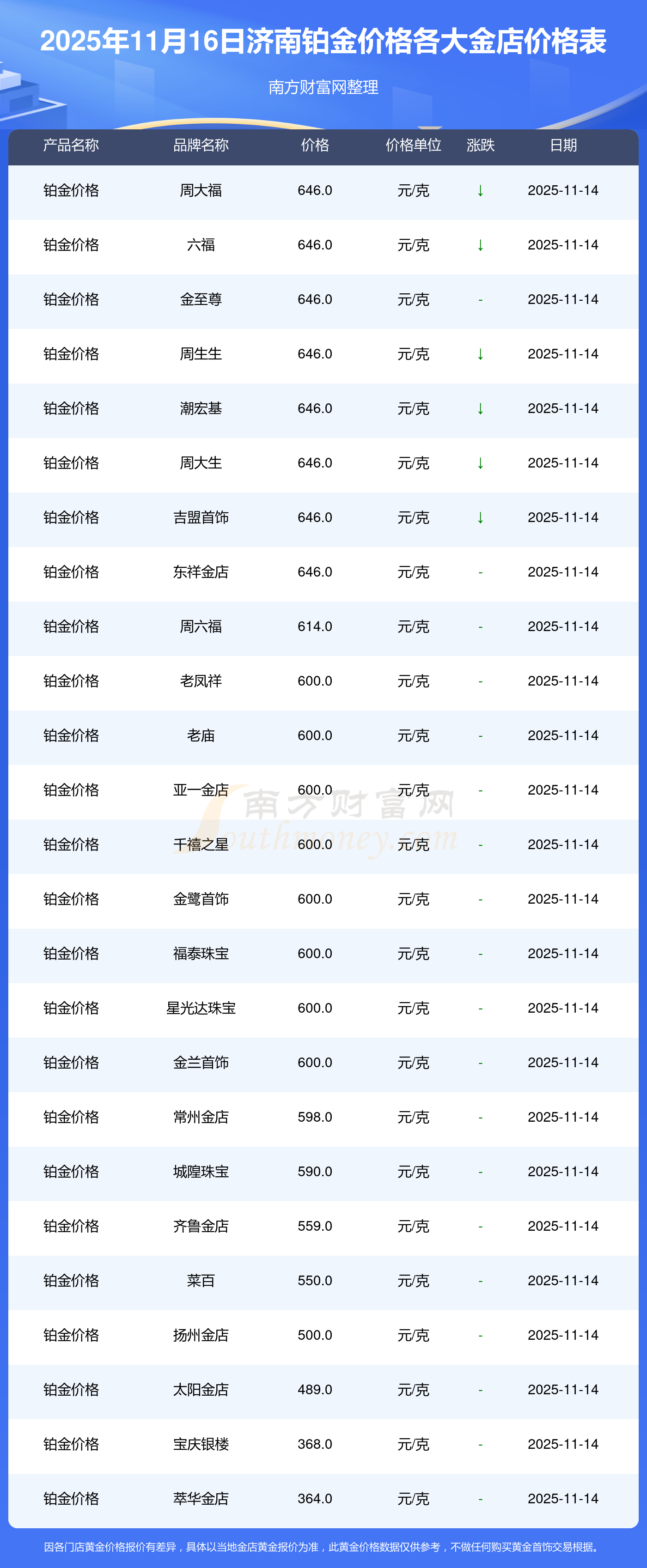 今天是2025年11月16日,濟(jì)南周大福、周大福、周大福、周大福、周大福、周大福、周大福、老鳳祥、老鳳祥、老鳳祥、周六福等各大金店品牌鉑金價格最新價格行情是這樣的:周大福1333.0元/克、周大福646.0元/克、周大福1333.0元/克、周大福46320.0、周大福18410.0、周大福41780.0、周大福1167.0元/克、老鳳祥1322.0元/克、老鳳祥600.0元/克、老鳳祥1322.0元/克、周六福1295.0元/克。