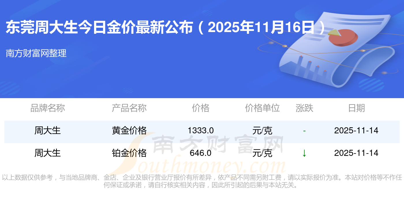 2025年11月16日東莞周大生最新價格:黃金價格1333.0元/克,鉑金價格646.0元/克,飾品金價(內(nèi)地)1333.0元/克,黃金飾品(香港)46320.0,鉑金價格(香港)18410.0,金條價格(香港)41780.0,金條金價(內(nèi)地)1167.0元/克,黃金價格1322.0元/克,鉑金價格600.0元/克,足金價格1322.0元/克,黃金價格1295.0元/克。