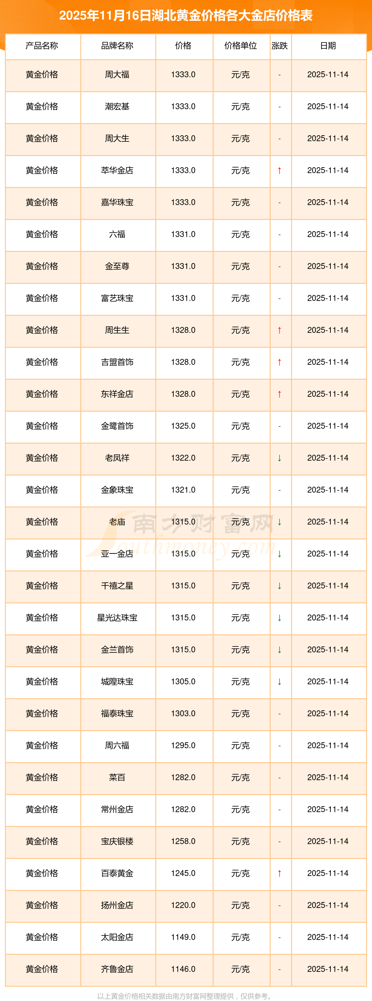 2025年11月16日湖北各大金店黃金價(jià)格最新價(jià)格查詢來了:周大福1333.0元/克,周大福646.0元/克,周大福1333.0元/克,周大福46320.0,周大福18410.0,周大福41780.0,周大福1167.0元/克,老鳳祥1322.0元/克,老鳳祥600.0元/克,老鳳祥1322.0元/克,周六福1295.0元/克。