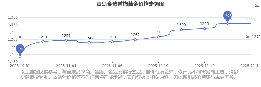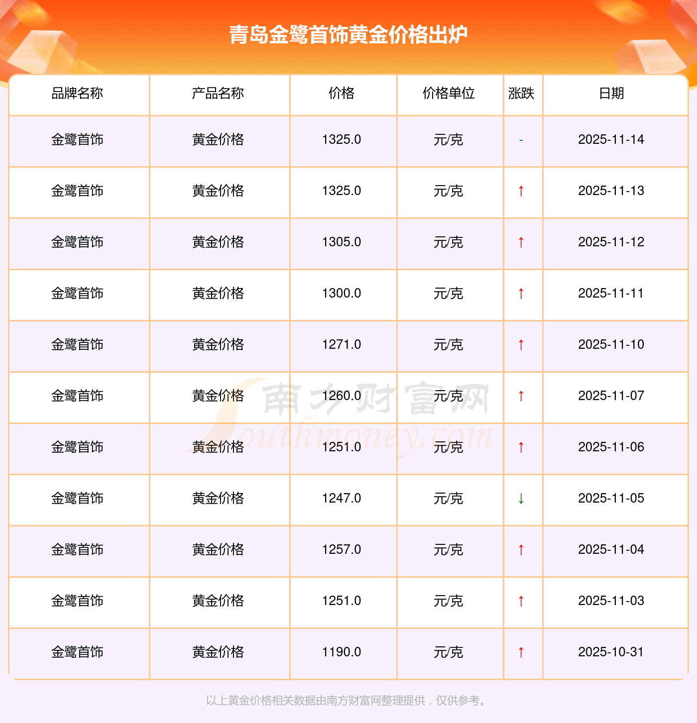 今日(2025年11月16日),1325.0元/克是青島金鷺首飾黃金價格的價格標準。