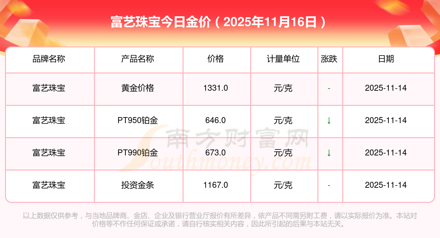 現(xiàn)在富藝珠寶黃金價(jià)格是多少錢1克_2025年富藝珠寶今日金價(jià)是多少錢一克,最新富藝珠寶查詢,2025年11月16日富藝珠寶投資金條現(xiàn)在每克多少錢?最新富藝珠寶投資金條報(bào)價(jià)公布,一起來看看吧!