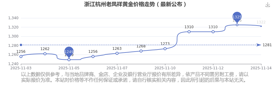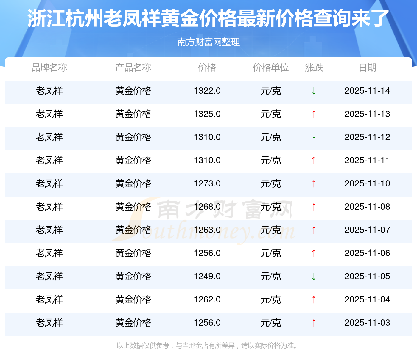 今日浙江杭州老鳳祥黃金價格最新價格是1322.0元/克。