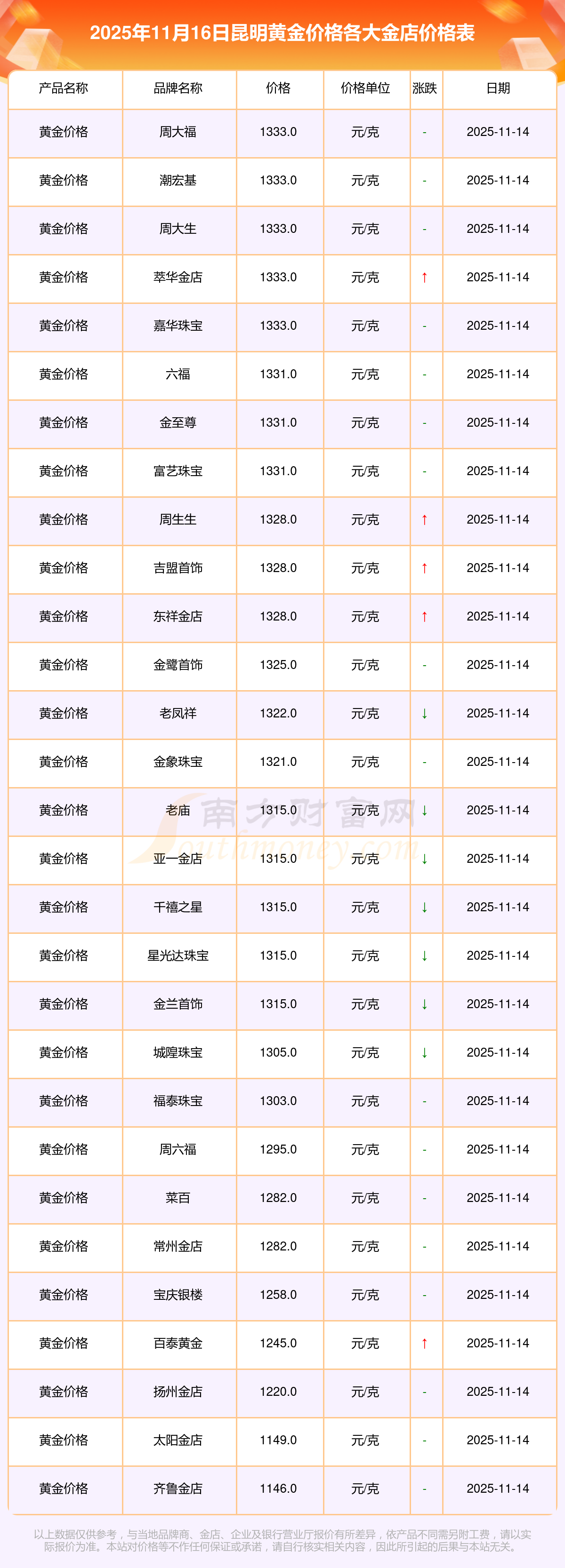 2025年11月16日昆明周大福、周大福、周大福、周大福、周大福、周大福、周大福、老鳳祥、老鳳祥、老鳳祥、周六福等各大金店品牌黃金價(jià)格最新價(jià)格如下:周大福黃金價(jià)格1333.0元/克,周大福鉑金價(jià)格646.0元/克,周大福飾品金價(jià)(內(nèi)地)1333.0元/克,周大福黃金飾品(香港)46320.0,周大福鉑金價(jià)格(香港)18410.0,周大福金條價(jià)格(香港)41780.0,周大福金條金價(jià)(內(nèi)地)1167.0元/克,老鳳祥黃金價(jià)格1322.0元/克,老鳳祥鉑金價(jià)格600.0元/克,老鳳祥足金價(jià)格1322.0元/克,周六福黃金價(jià)格1295.0元/克。