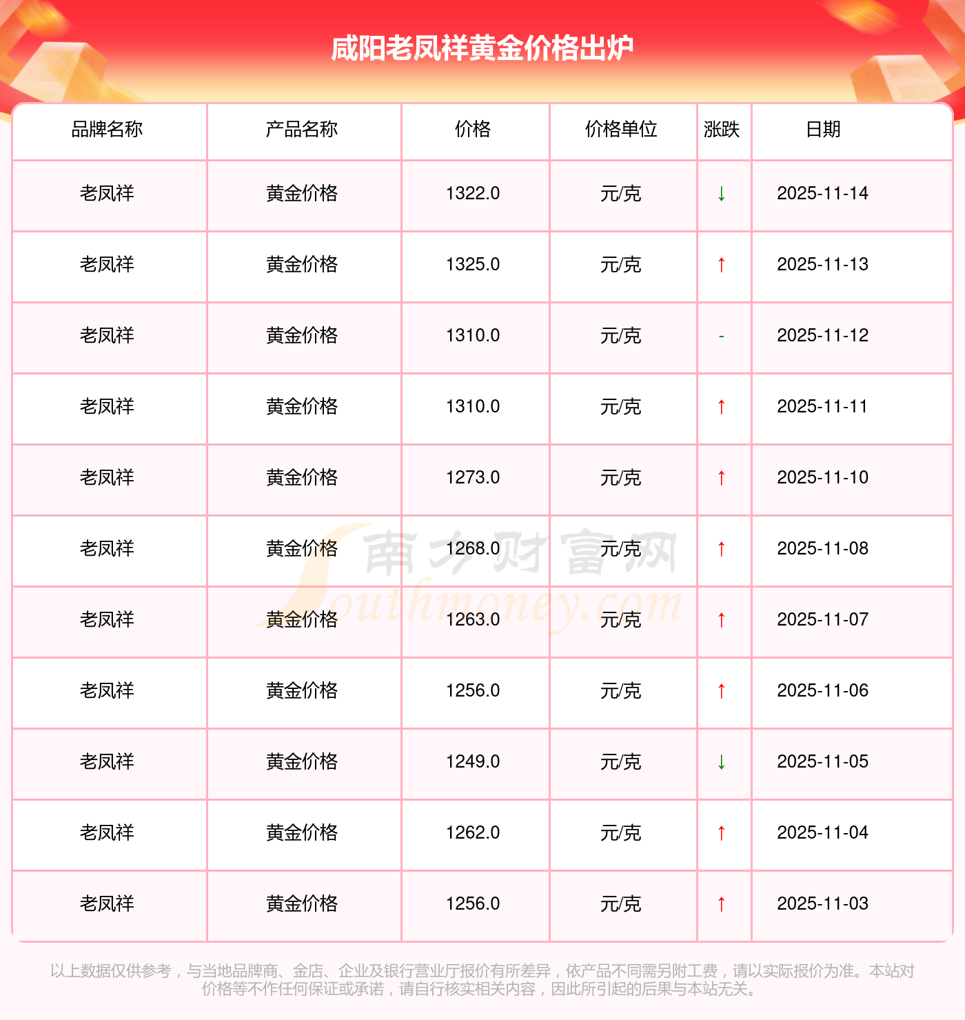 今日(2025年11月16日),咸陽老鳳祥黃金價(jià)格每克的價(jià)值為1322.0元/克。