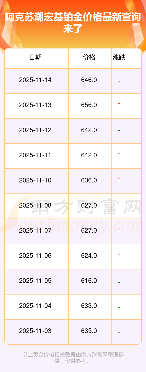 2025年11月16日,周大福、周大福、周大福、周大福、周大福、周大福、周大福、老鳳祥、老鳳祥、老鳳祥、周六福等各大金店品牌鉑金價格今日價格如下:周大福1333.0元/克、周大福646.0元/克、周大福1333.0元/克、周大福46320.0、周大福18410.0、周大福41780.0、周大福1167.0元/克、老鳳祥1322.0元/克、老鳳祥600.0元/克、老鳳祥1322.0元/克、周六福1295.0元/克。