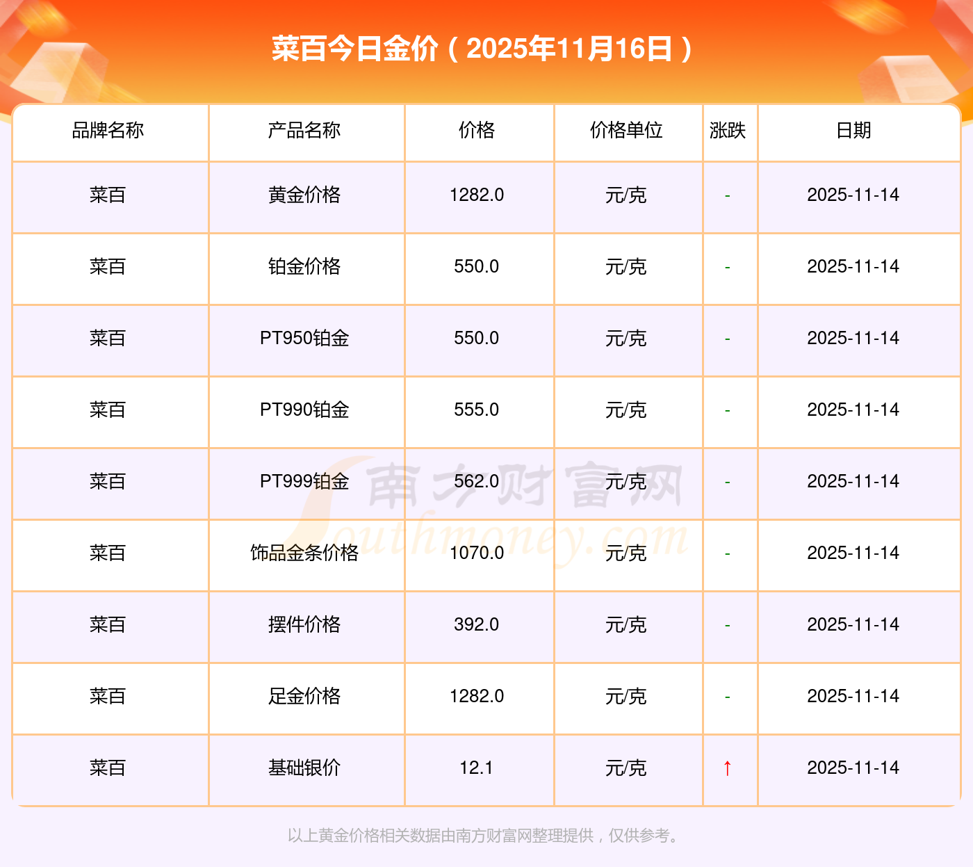 2025年11月16日各大金店P(guān)T950鉑金最新價(jià)格:周大福1333.0元/克,周大福646.0元/克,周大福1333.0元/克,周大福46320.0,周大福18410.0,周大福41780.0,周大福1167.0元/克,老鳳祥1322.0元/克,老鳳祥600.0元/克,老鳳祥1322.0元/克,周六福1295.0元/克。