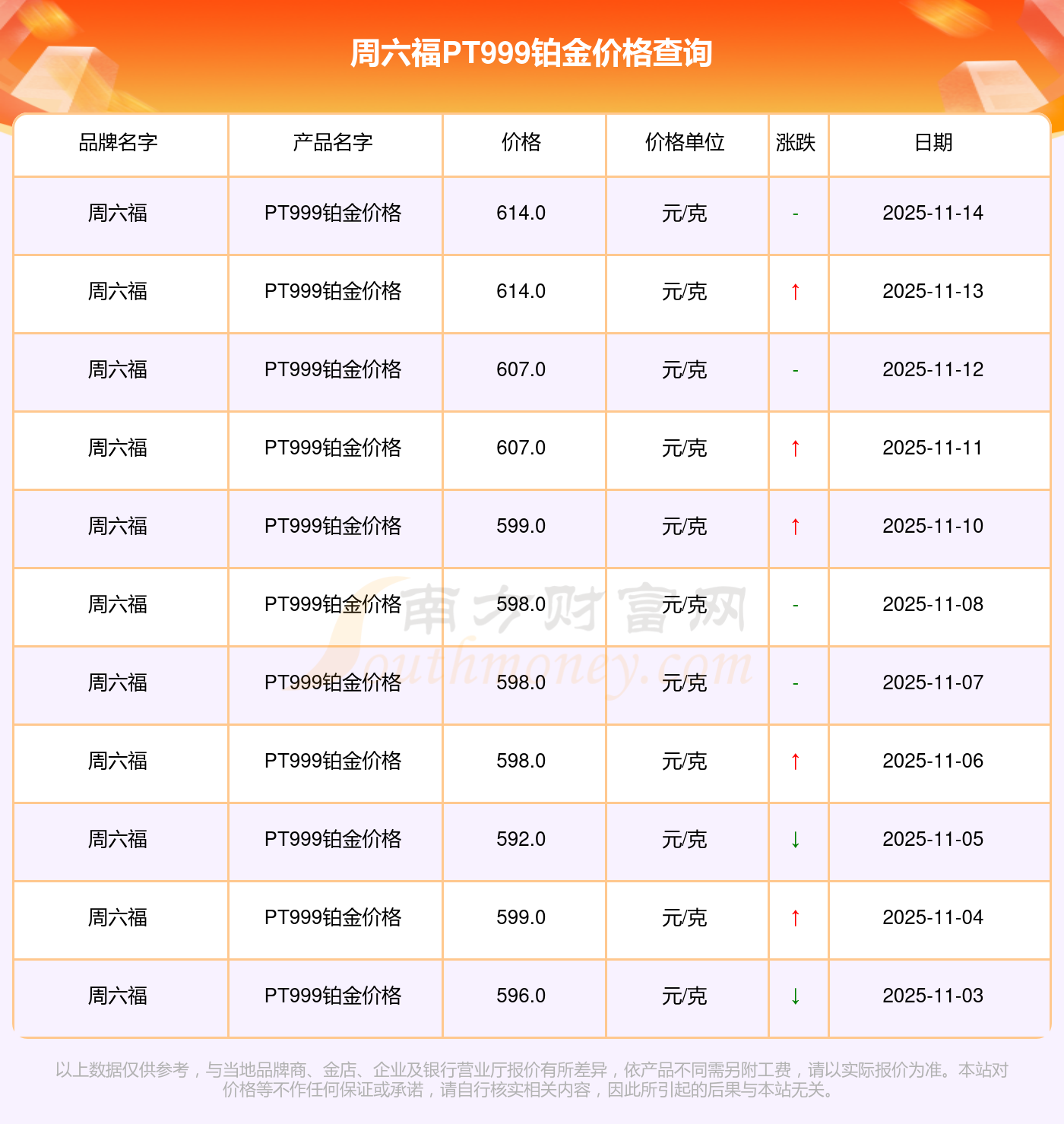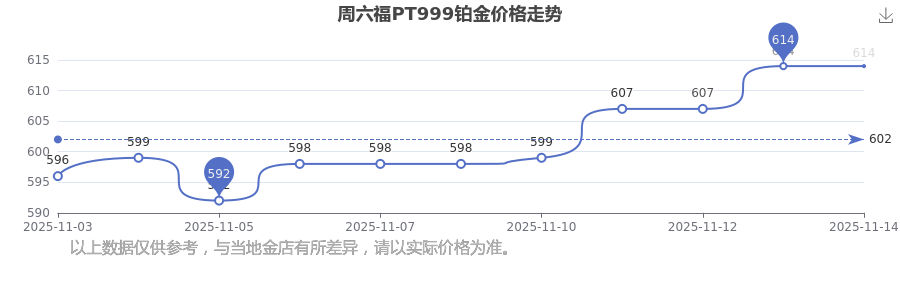 今日(2025年11月16日),周六福PT999鉑金價(jià)格最新價(jià)格是614.0元/克。