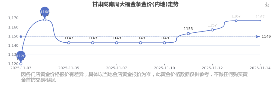 今日(2025年11月16日),1167.0元/克是甘肅隴南周大福金條金價(jià)(內(nèi)地)的價(jià)格標(biāo)準(zhǔn)。