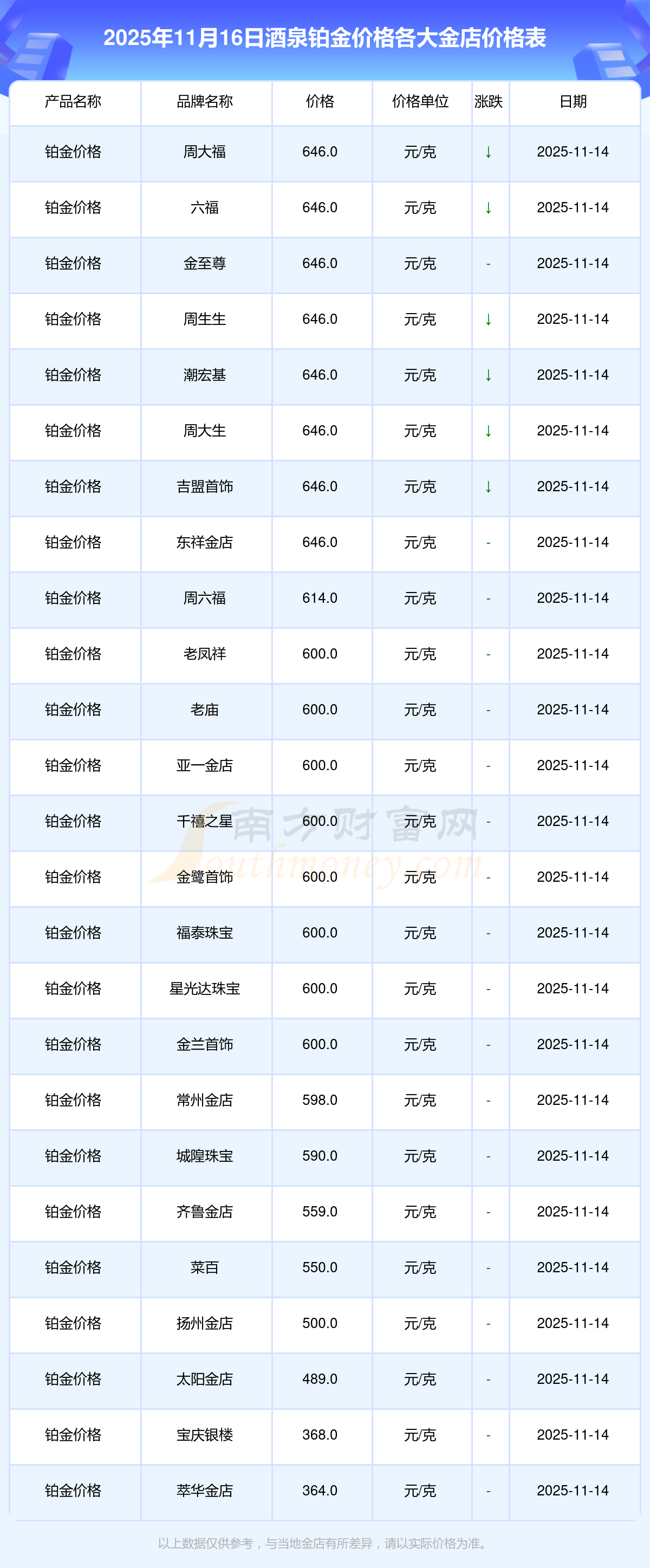 2025年11月16日酒泉周大福、周大福、周大福、周大福、周大福、周大福、周大福、老鳳祥、老鳳祥、老鳳祥、周六福等各大金店品牌鉑金價(jià)格最新價(jià)格行情來(lái)了,如下:周大福黃金價(jià)格1333.0元/克,周大福鉑金價(jià)格646.0元/克,周大福飾品金價(jià)(內(nèi)地)1333.0元/克,周大福黃金飾品(香港)46320.0,周大福鉑金價(jià)格(香港)18410.0,周大福金條價(jià)格(香港)41780.0,周大福金條金價(jià)(內(nèi)地)1167.0元/克,老鳳祥黃金價(jià)格1322.0元/克,老鳳祥鉑金價(jià)格600.0元/克,老鳳祥足金價(jià)格1322.0元/克,周六福黃金價(jià)格1295.0元/克。