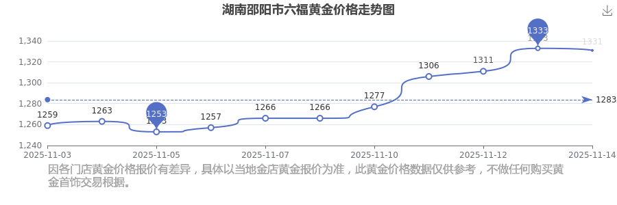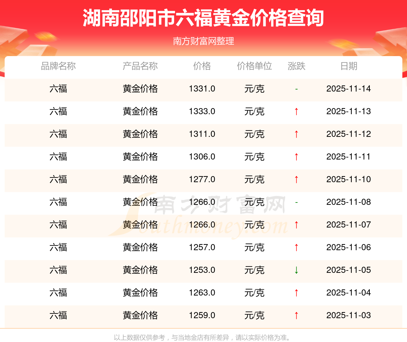 今日湖南邵陽(yáng)市六福黃金價(jià)格:1331.0元/克。