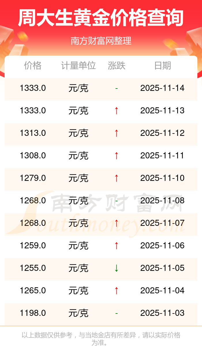 2025年11月16日周大生黃金價格查詢:1333.0元/克。