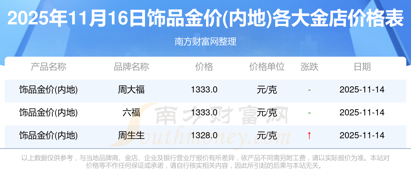 2025年11月16日周大福、周大福、周大福、周大福、周大福、周大福、周大福、老鳳祥、老鳳祥、老鳳祥、周六福等各大金店品牌飾品金價(jià)(內(nèi)地)最新價(jià)格如下:周大福黃金價(jià)格1333.0元/克,周大福鉑金價(jià)格646.0元/克,周大福飾品金價(jià)(內(nèi)地)1333.0元/克,周大福黃金飾品(香港)46320.0,周大福鉑金價(jià)格(香港)18410.0,周大福金條價(jià)格(香港)41780.0,周大福金條金價(jià)(內(nèi)地)1167.0元/克,老鳳祥黃金價(jià)格1322.0元/克,老鳳祥鉑金價(jià)格600.0元/克,老鳳祥足金價(jià)格1322.0元/克,周六福黃金價(jià)格1295.0元/克。