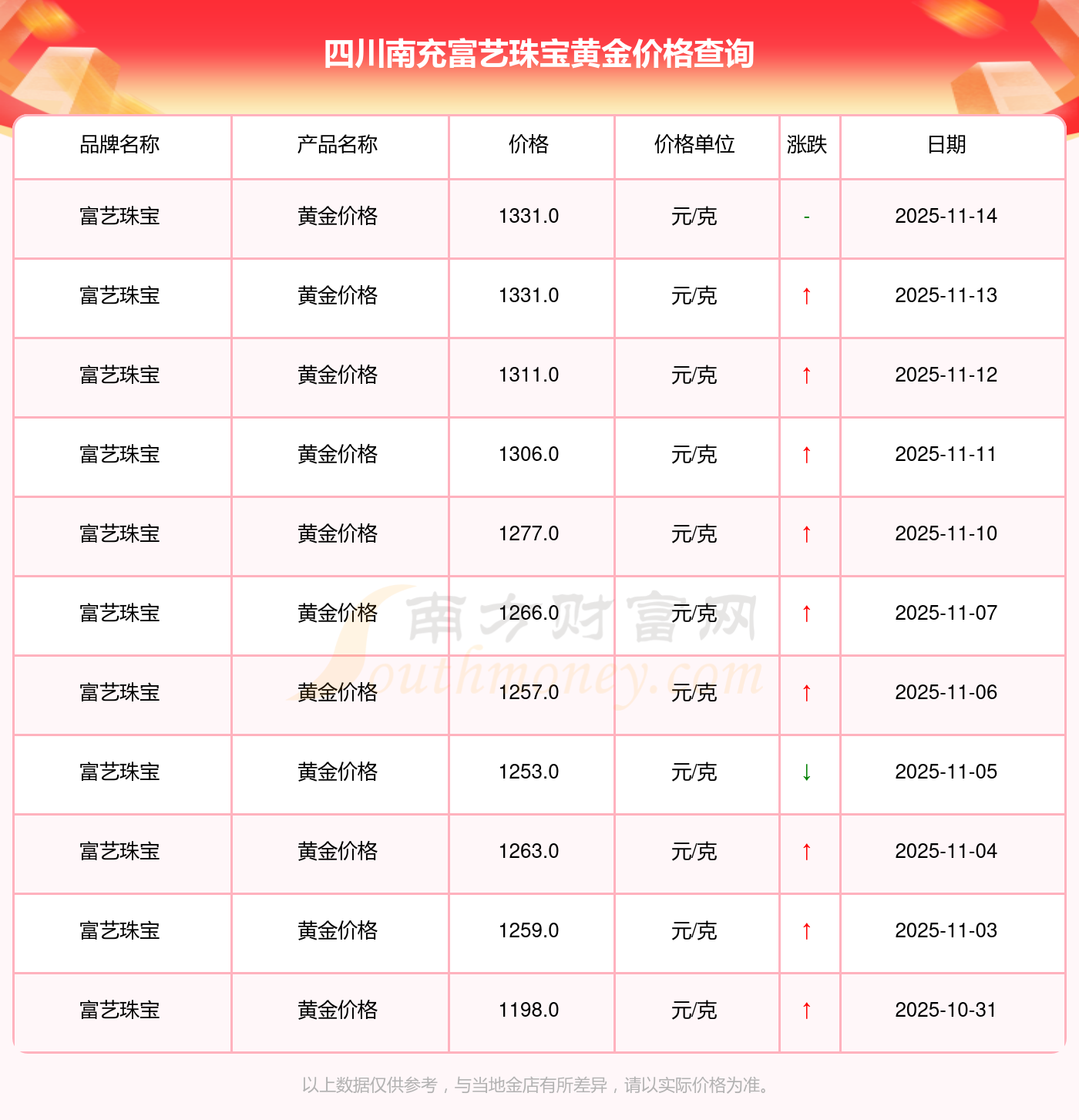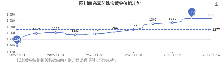 四川南充富藝珠寶在 2025年11月16日,黃金價(jià)格的售賣(mài)價(jià)格是 1331.0元/克。